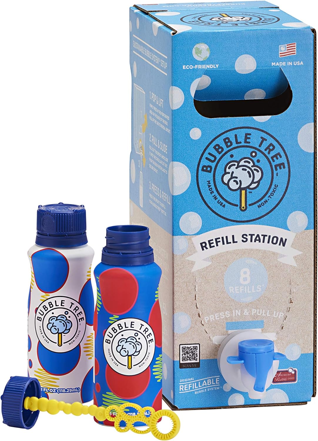 - CONTAINS 1.23 LITERS (41 FL OZ) OF BUBBLE TREE ECO-FRIENDLY NON TOXIC BUBBLE SOLUTION: 1 Liter (33.81 Fl oz) of solution that is encased in a recyclable pouch that resides in a sealed compartment of the box and 2 aluminum bottles filled with 4 Fl oz of solution.