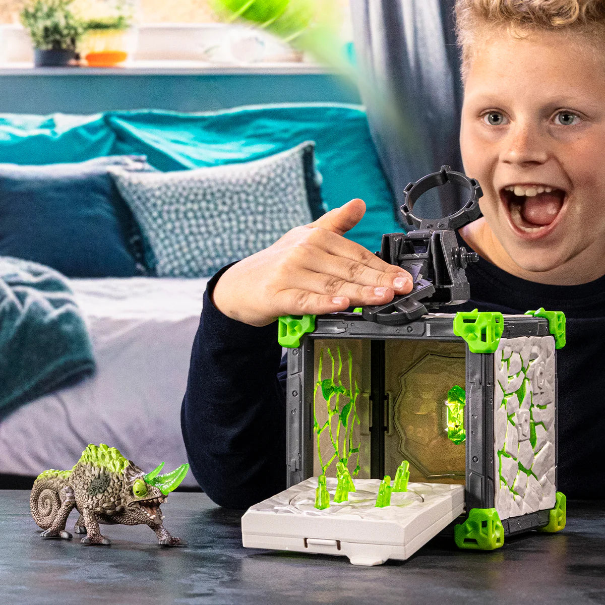 The Stone Chameleon has expanded his BattleCave into a real fortress to protect the World Crystal inside from thieves. With its oversized eyes, it can see from afar when attackers are approaching. Time to bring the catapult on the roof into position and put in the ammunition. Better take cover from the big orb coming your way! The Chameleon is a pretty good shot and can also attach the catapult to the side of the BattleCave if needed. The ELDRADOR® CREATURES BattleCaves transform every children's room into an action zone! Who will face the breathtaking battle? All BattleCaves can be combined. Scary tunnels, and tricky traps await the attackers. In the big arena they can then meet for the final duel. What a fight!