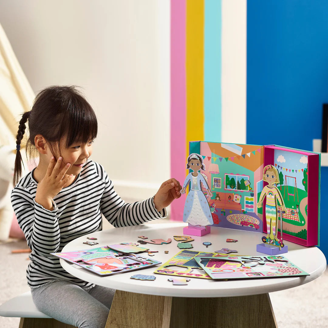 Children can have DOUBLE the fun with our Magnetic Dress Up Best Friends set. Includes 2 magnetic dolls (who are also the BEST of friends), contains over 70 magnetic outfit and play pieces to mix and match for endless combinations. Fold the box out to create a magnetic play room scene and a fun outdoor play scene! The lovely reusable box comes with a magnetic closure and keeps all parts safe for next time!