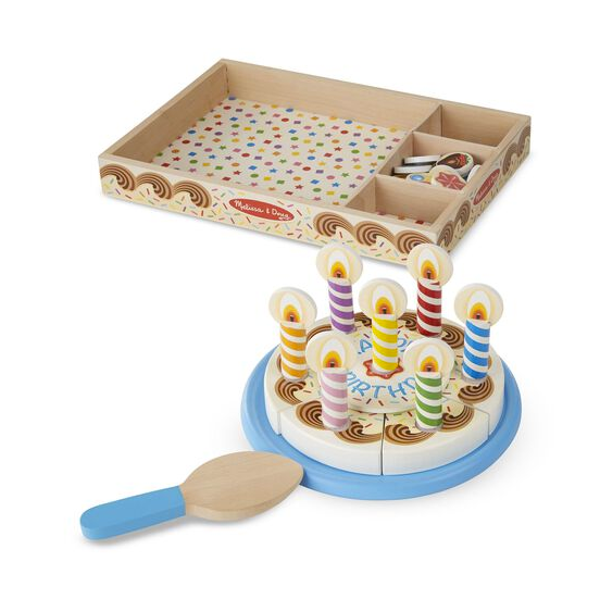 Every day is a celebration with our festive birthday party! This wooden set includes six ready-to-cut slices of cake, removable candles and toppings, and a cake plate and server. Use the serving knife to cut a piece and hear a slicing sound! All 34 pieces store neatly in the wooden box until the next celebration.