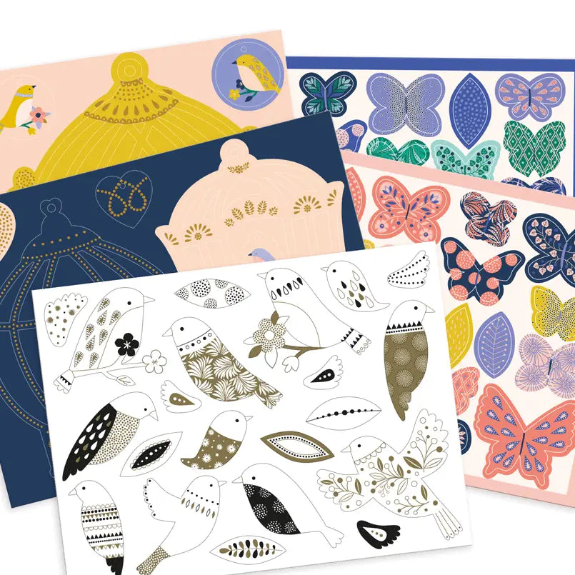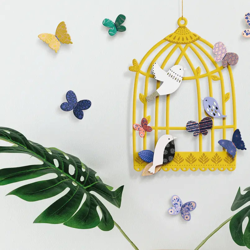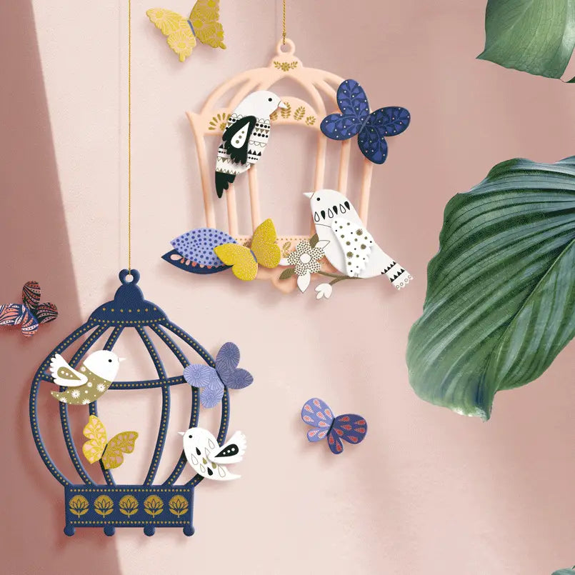 Create a beautiful hanging mobile Compose an enchanting decor ! Thanks to the elements of this creative decoration, embellish the three cages and install delicately the birds in their new house... can you hear them sing? Ages 6 and up - 3 pretty cages in different shapes to hang with the gold thread supplied - 50 coloured leaves and butterflies - Charming birds to paint or color - Give a poetic decorative touch to the kids' room - Packaging: 31x22x2 cm