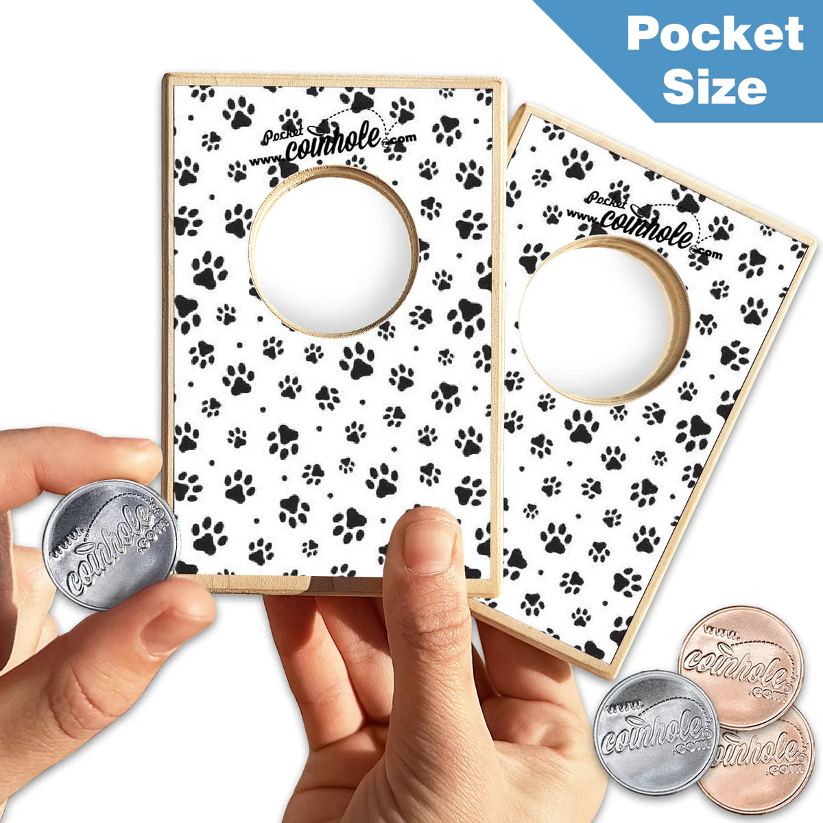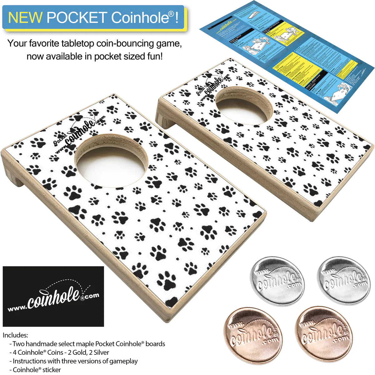 NEW POCKET Coinhole®! Your favorite tabletop coin-bouncing game, now available in pocket sized fun! Enjoy a game of POCKET Coinhole® on this handmade Paw Print Coinhole® boards. POCKET Coinhole® is the perfect gift for the whole family.
