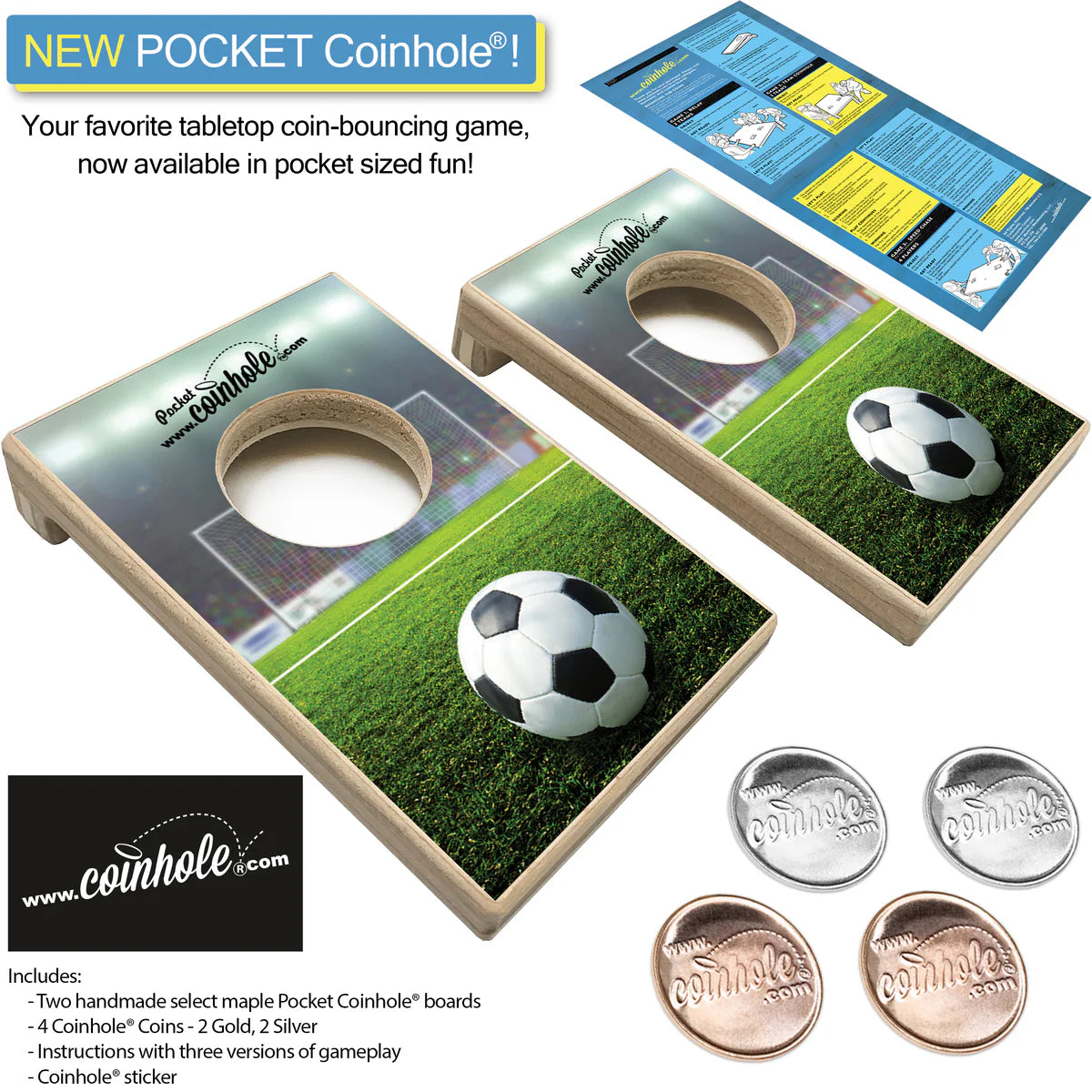 NEW POCKET Coinhole®! Your favorite tabletop coin-bouncing game, now available in pocket sized fun! Enjoy a game of POCKET Coinhole® on this handmade Soccer field Coinhole® boards. POCKET Coinhole® is the perfect gift for the whole family.