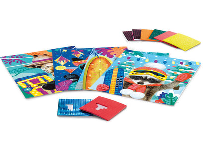 These photo mosaic kits each include 4 animal-themed posters to decorate with foam tile stickers. The tiles come in a variety of colors and textures, each kit including 8 sticker sheets (144 stickers on each). Each individual square sticker is approximately 0.5 cm. The posters measure 7.5"x 9" and are made of thick, glossy cardstock. The posters feature colored squares to indicate where stickers should be placed and which colors to use. Included is a cardboard display stand to show off finished projects. The chest set, different from the other sets, features a small treasure chest to decorate. Makes a fun activity for parties and school projects! The back of the packaging features a scannable QR code which leads to a video and more details about the product