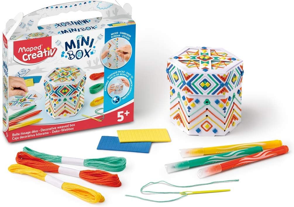The Maped Creativ Decorated String Art Storage Box lets your child create & decorate their personal treasure chest with markers, string and stickers! Quickly construct your box via folded paper, color and then decorate it with yarn & stickers! Unique design doesn't require any glue or tape and when finished is the perfect place for a child to hide their treasures in their room! The complete kit contains everything you need to decorate and then play: Box to build, 3 colored string bundles, 1 plastic safety needle, 2 sheets of mosaic stickers and 3 Jungle Washable Fine Tip markers. Maped Creativ offers a collection of innovative, ultra-fun and stimulating activity kits for children of all ages! All kits are designed to be made with their own hands with minimal adult assistance to produce unique creations to play with and display.