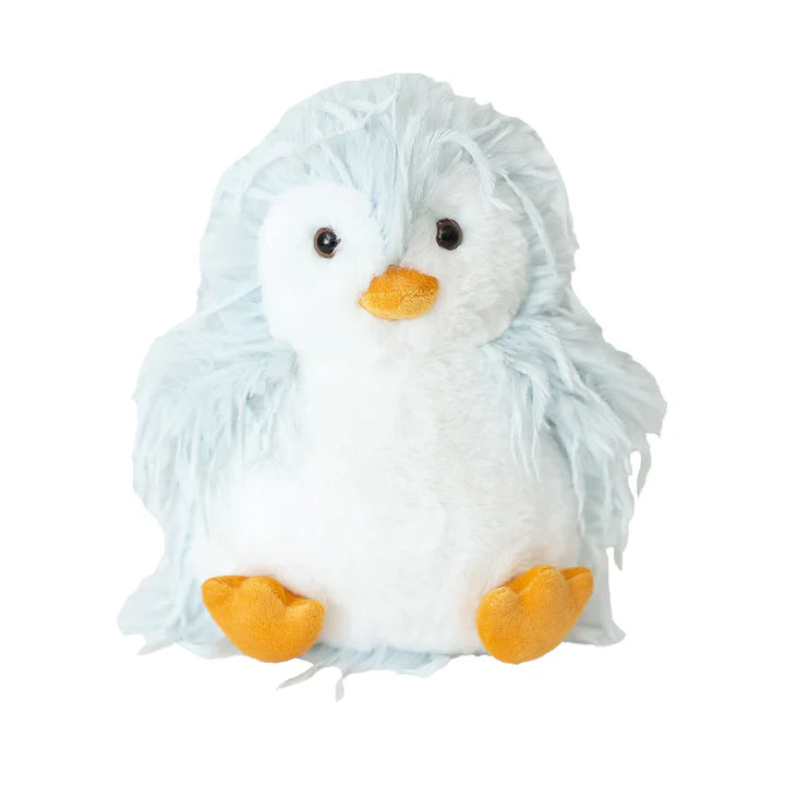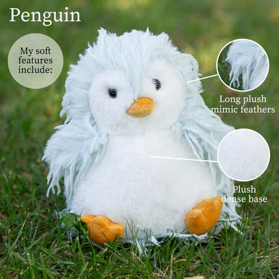 The Feathers Sky Penguin features stunning powder-blue plush with contrasting white belly, adorable orange beak and feet details, and revolutionary feather-inspired fabric that creates unmatched softness.