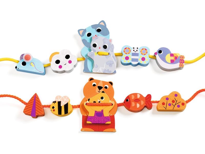 Djeco Lacing Game FILAMUM. With the wooden beads your children can thread small chains and thus improve their fine motor skills. The thick beads are shaped for easy grasping and the strings are strong enough to make threading easy. Great fun for children ages 2 and up. Contents: 8 beads, 4 wooden plates and 2 laces. Age: +2 years.