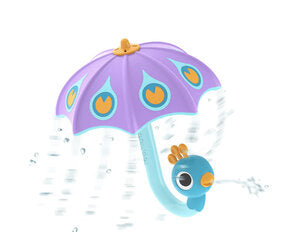 Raise the umbrella and turn it upright, then watch as water sprinkles from the peacock’s mouth and the umbrella gently pours rain.