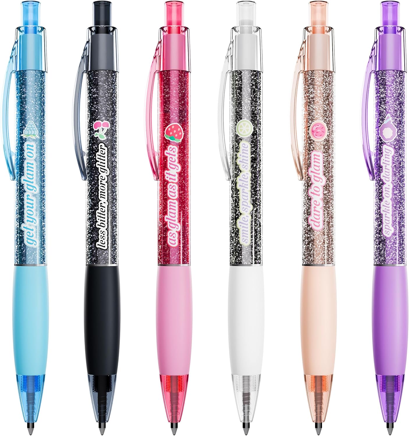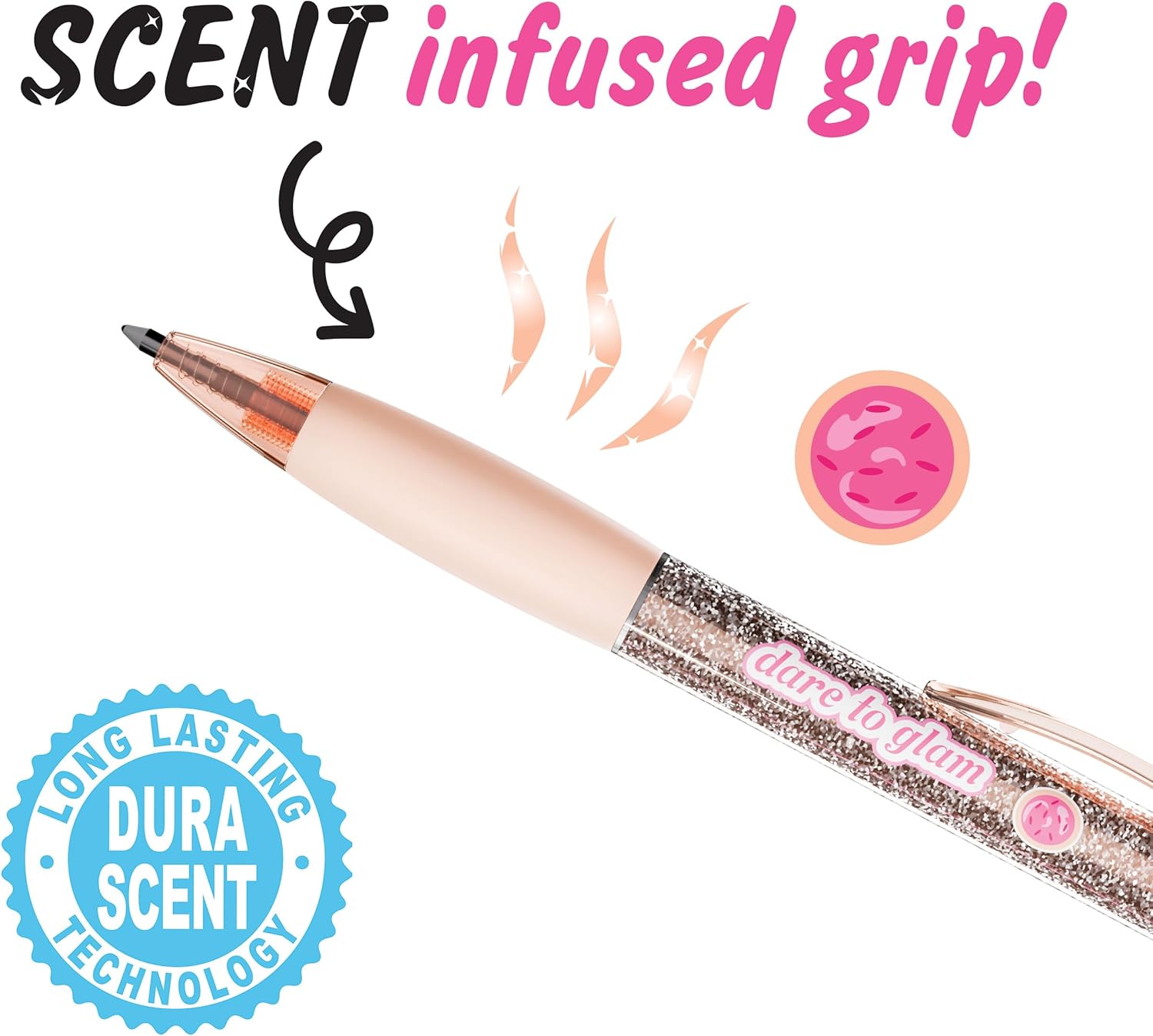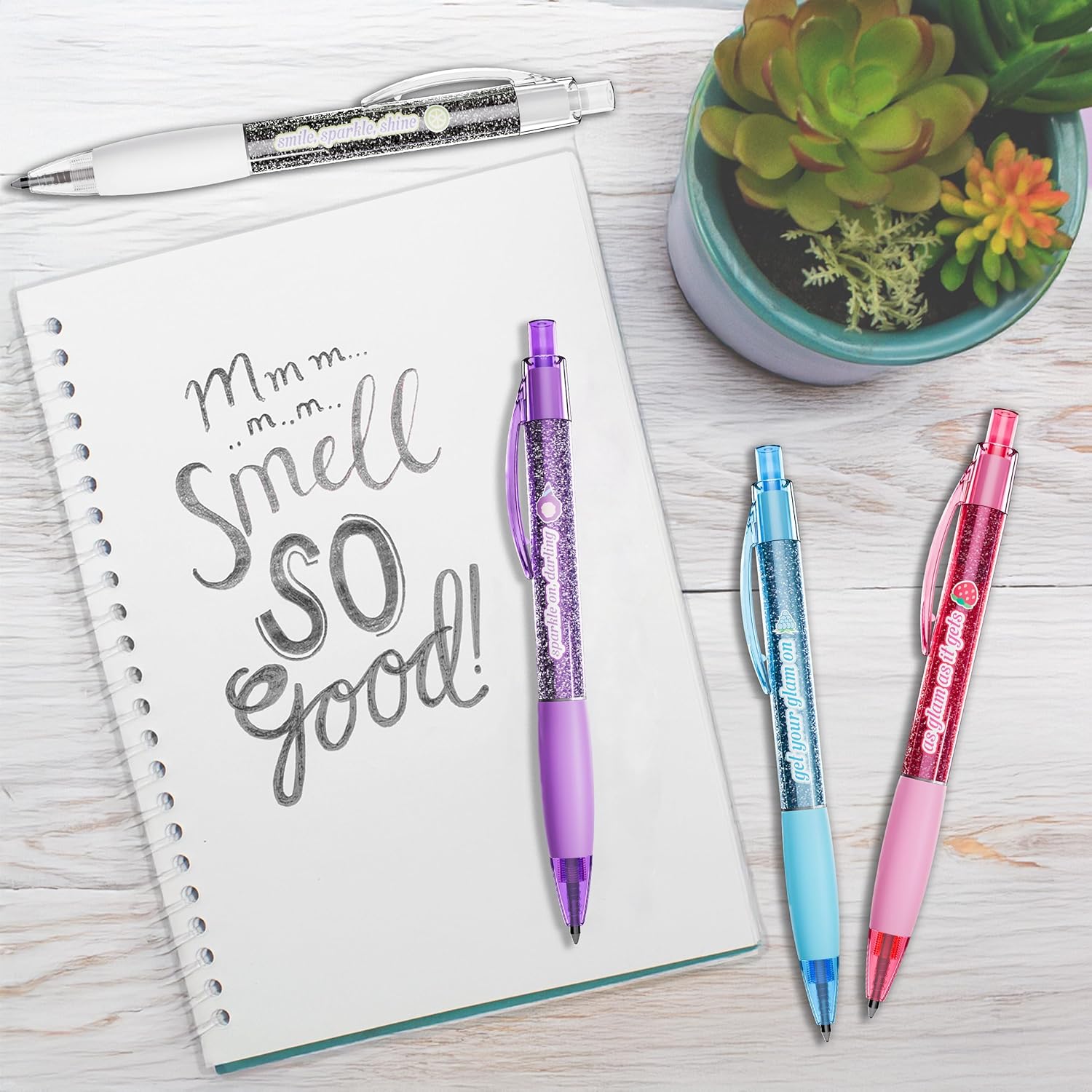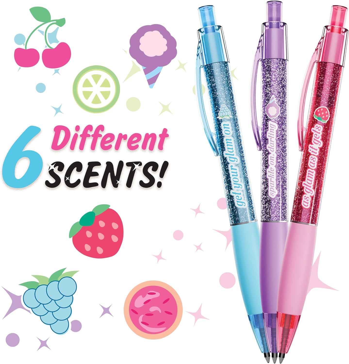 - Glitter Glam Smens contains six black glitter gel ink pens with six unique scents through the grip.