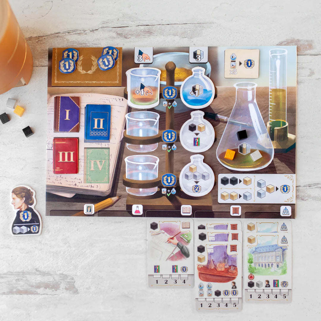In the Footsteps of Marie Curie combines resource management and transformation mechanics, utilizing a dynamic card river and contract system. Resources such as Pitchblende, Uranium, and Radium are distributed via a cube tower, with each turn offering surprises based on retention or overproduction of these elements. Players traverse Marie Curie's life timeline on a central board, with the game concluding upon reaching its conclusion.