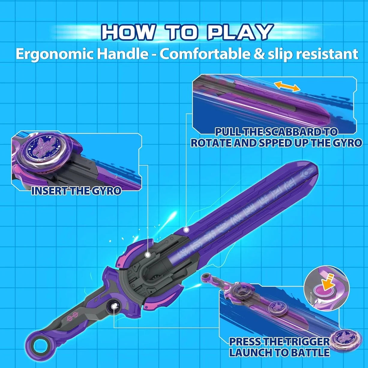⚔️ Epic Sword Launcher – Includes a 13.5” sword launcher and high-speed spinning top gyro for intense, head-to-head competition.