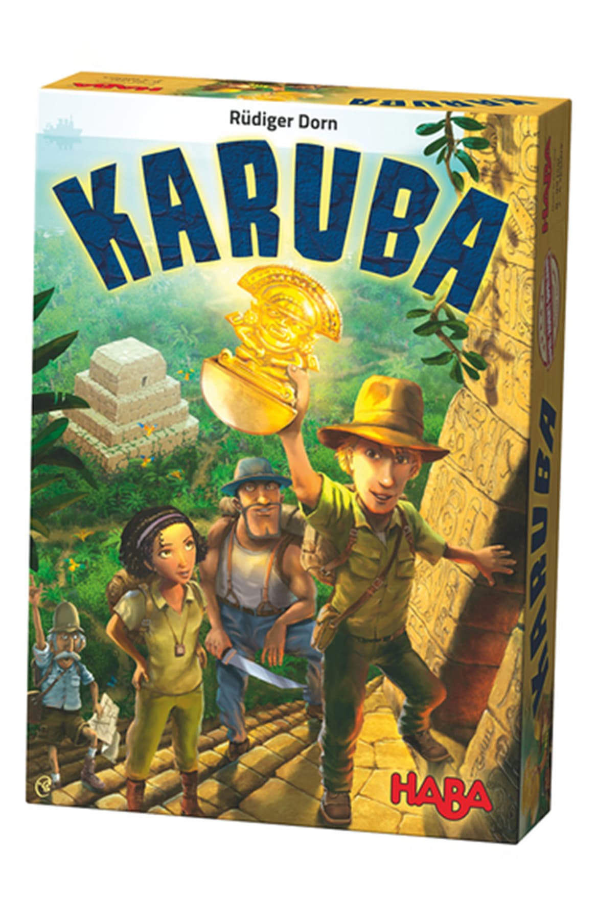 Many moons have come and gone since your boats departed on the journey to Karuba. Once you arrive on the island, each player will lead an expedition team of four adventurers. Now you just have to navigate your way through the dense jungle to make it to the temples. „Just“ may be something of an understatement; the ancient jungle trails have to be found and uncovered first! Hurry up and be the first to reach the temples to collect the most valuable treasures. Many paths have dead ends and you need to be patient to find the right/best way (through the jungle). Look! A gold nugget! You can pick it up and collect it, same applies to the shiny crystals along the paths.