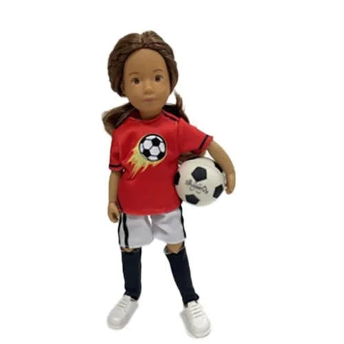 This is the Kruselings doll Sofia in the soccer court. Sofia wears a T -shirt, sport pants, crops, sneakers and she brings her own hairbrush. Sofia carries her favorite soccer ball, and is ready to shoot. Sofia is a 9 in. doll of high quality vinyl, with movable joints and life-like looking glass eyes. Suitable for children 36 months and over.