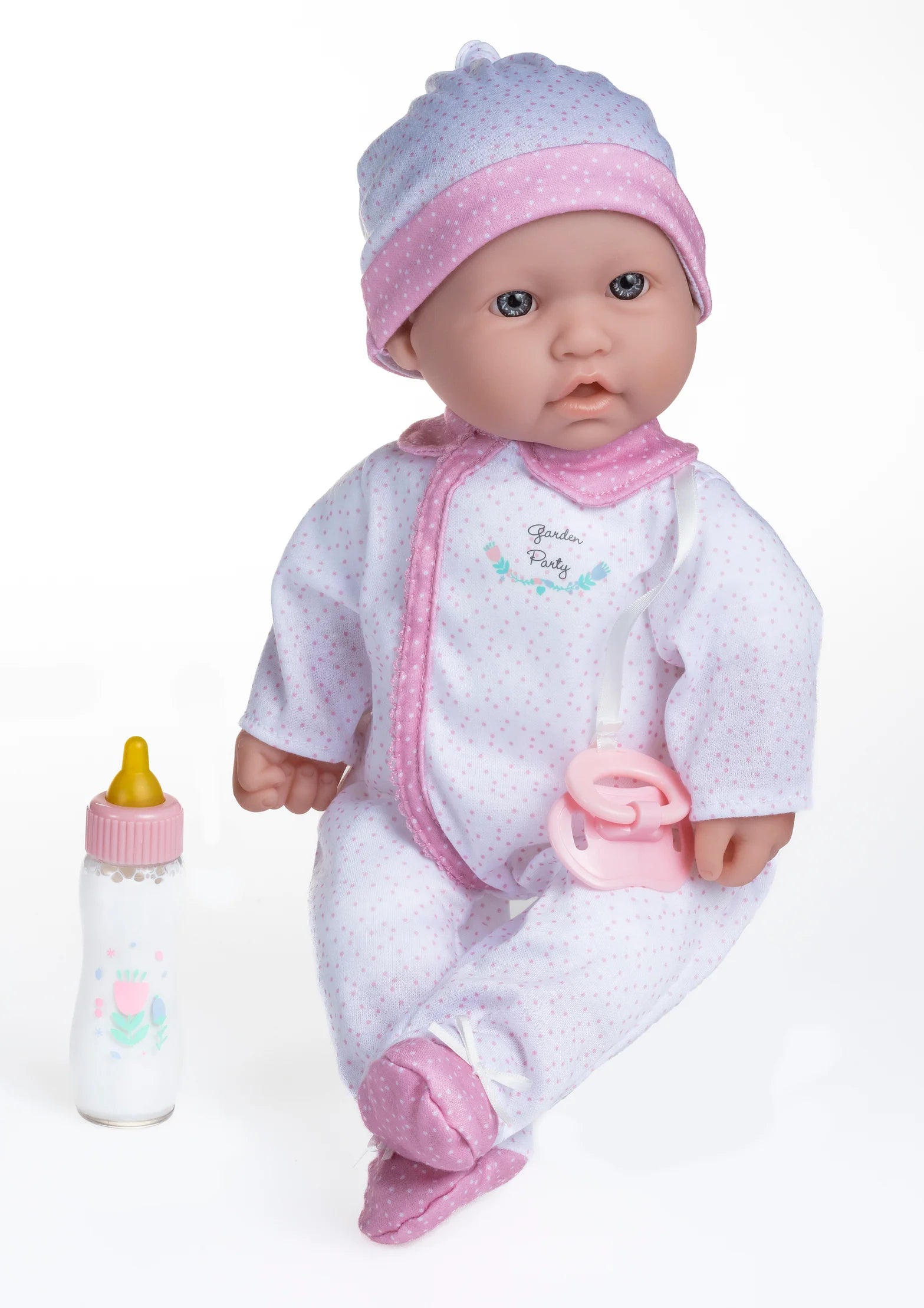 La Baby 16" Soft Body Baby Doll White/Pink Onesie w/ Pacifier & Magic Bottle