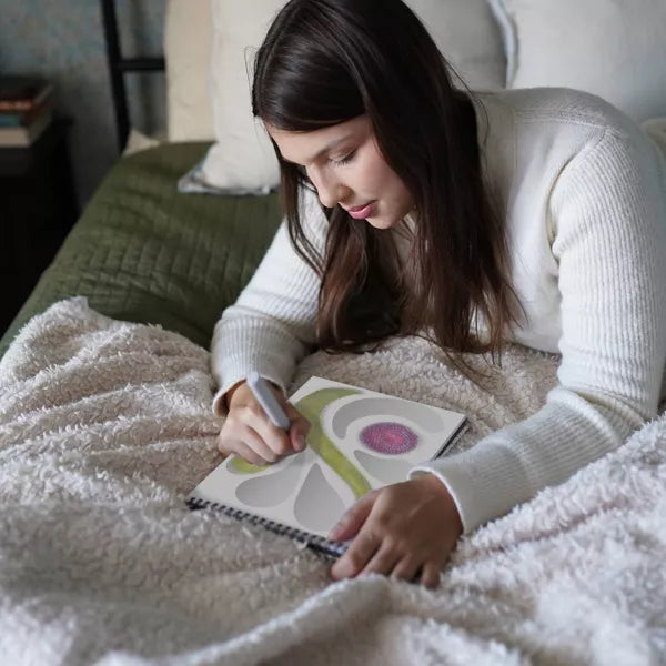 Lifelines FlowArt Pads are guided art meditations designed to help you achieve a calming flow state. Each scene is thoughtfully crafted to encourage repetitive, relaxing movements, promoting mindfulness and reducing stress. Pogo-Dot includes 20 meditative scenes and an innovative "pogo" marker with 4 interchangeable colors and 1 color-changing ink, all in a detachable storage tray. With each press, the delightfully bouncy pen adds multiple dots and gives a satisfying bounce-back. Layer dots to fill the page, creating a beautifully textured, dimensional scene; and, add color-changing ink to transform dots into new colors for a striking 3D effect. Compact and portable, this pad is perfect for calming your mind on-the-go, unwinding before bed, or taking a work or study break to de-stress.