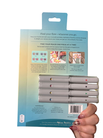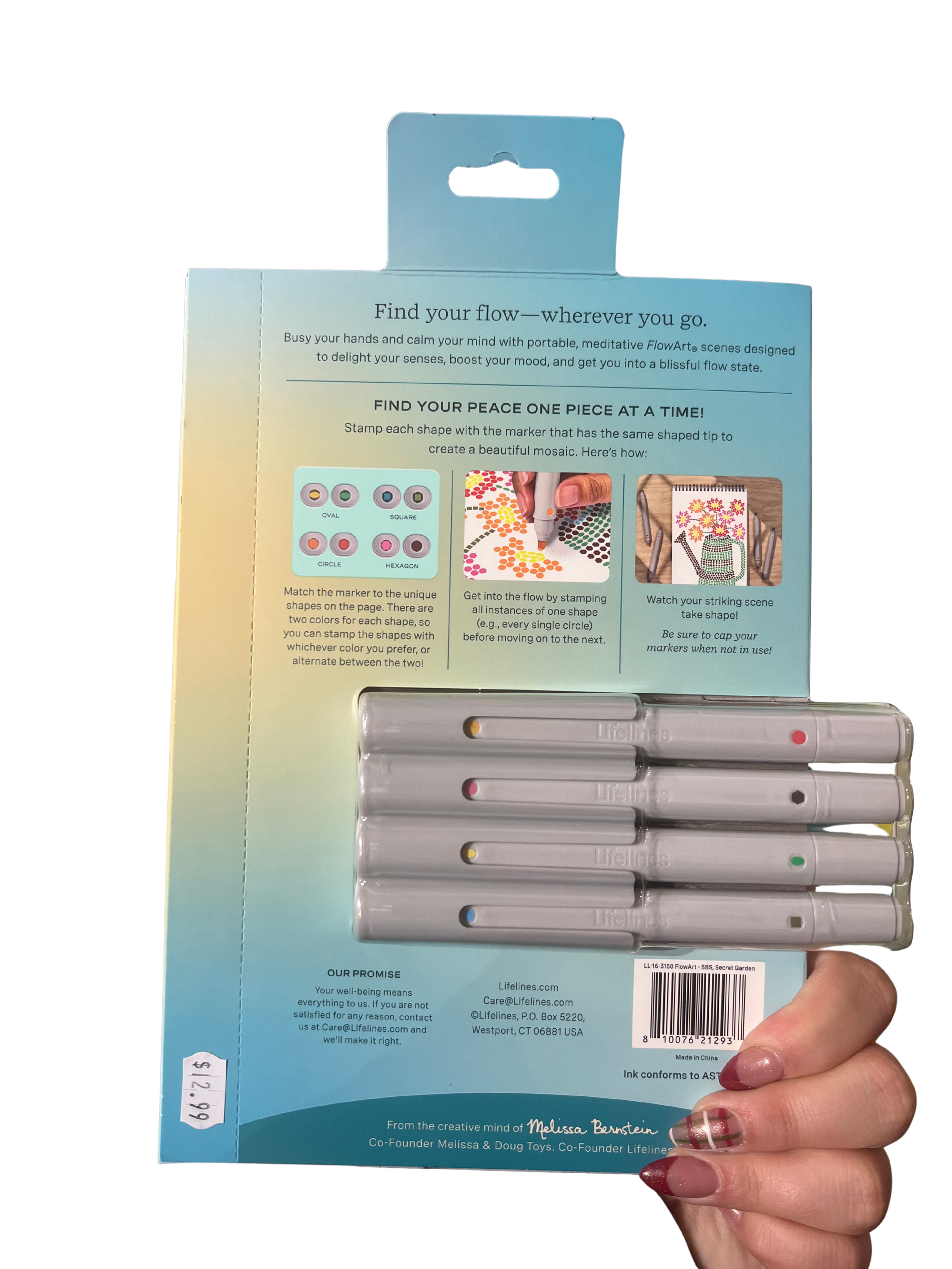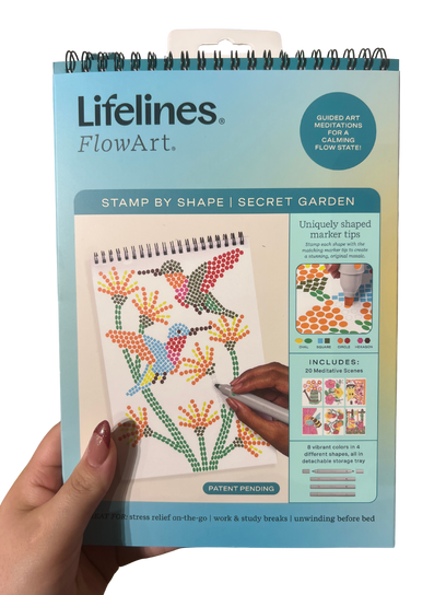 Lifelines FlowArt Pads are guided art meditations designed to help you achieve a calming flow state. Each scene is thoughtfully crafted to encourage repetitive, relaxing movements, promoting mindfulness and reducing stress. Secret Garden includes 20 meditative scenes and four double-sided "shape" markers in a detachable storage tray. Each marker has a uniquely shaped tip. Match each marker to the corresponding shape on the page to create a stunning, original mosaic. Compact and portable, this pad is perfect for calming your mind on-the-go, unwinding before bed, or taking a work or study break to de-stress.