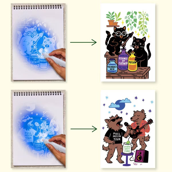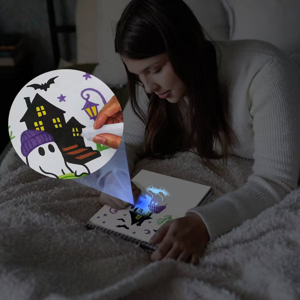 Lifelines FlowArt Pads are guided art meditations designed to help you achieve a calming flow state. Each scene is thoughtfully crafted to encourage repetitive, relaxing movements, promoting mindfulness and reducing stress. Illuminate & Create includes 20 meditative scenes and an innovative illuminating marker with 5 interchangeable colors, all in a detachable storage tray. Hover the marker's light over the page to reveal hidden, traceable scenes that create a frightfully fun surprise. Experience full immersion into this mesmerizing activity, as the illumination brings captivating detail to life, drops you into your flow, and results in a delightful scene. Compact and portable, this pad is perfect for calming your mind on-the-go, unwinding before bed, or taking a work or study break to de-stress.