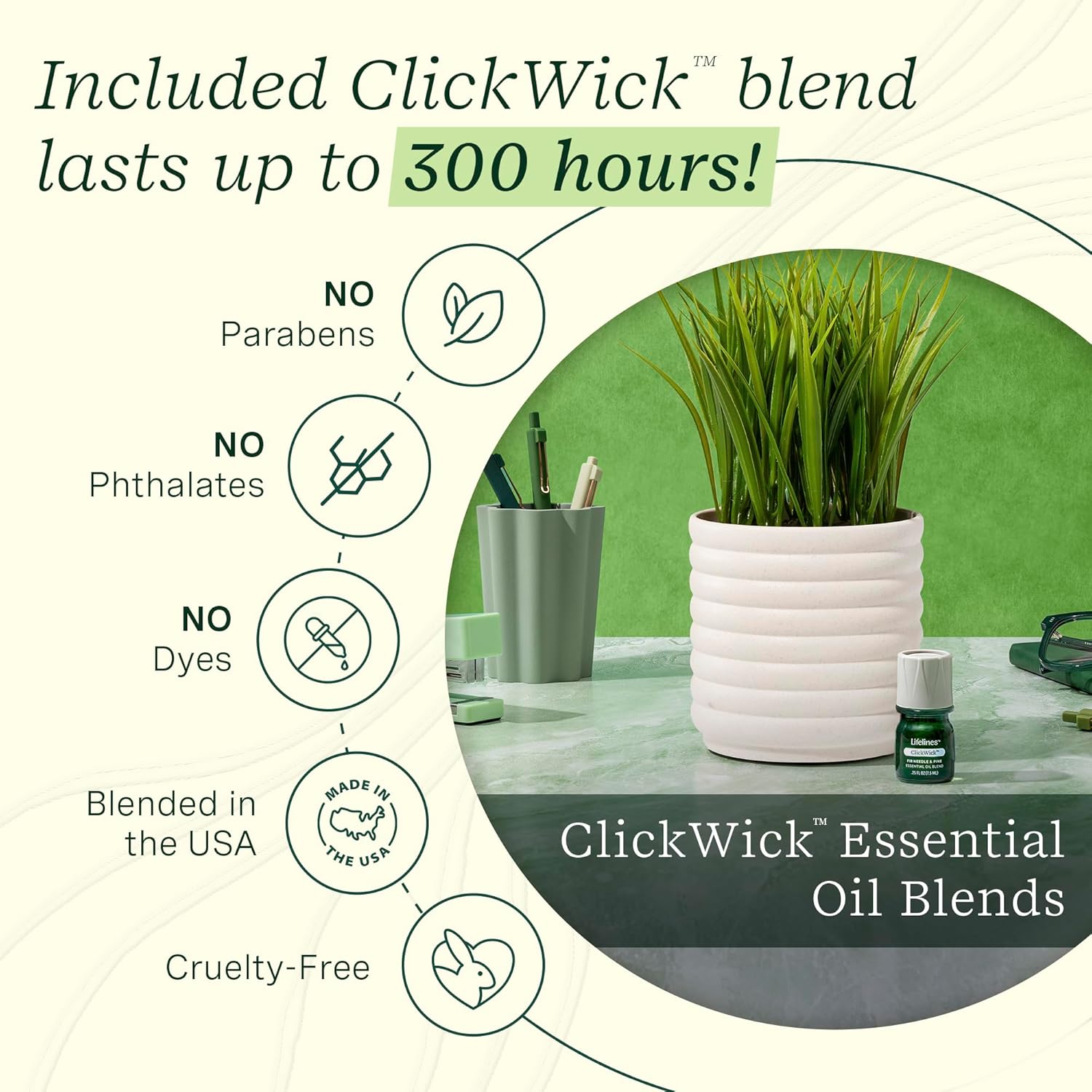 - Swap Scents Anytime: With our innovative ClickWick bottle, you can swap any ClickWick Blend into the bottom of the planter. Discover other blends so you can diffuse whatever suits your mood. Each ClickWick Essential Oil Blend lasts up to 300 hours.