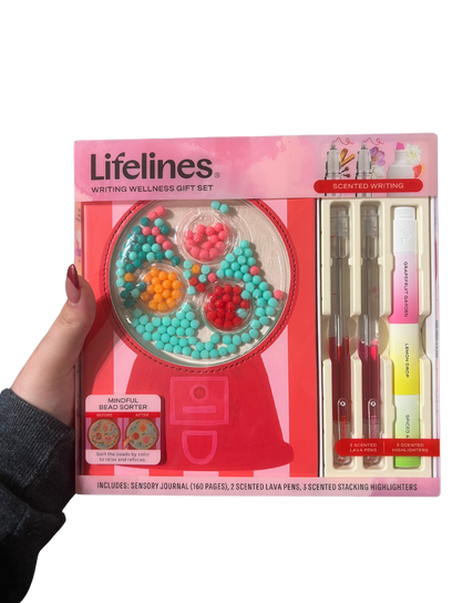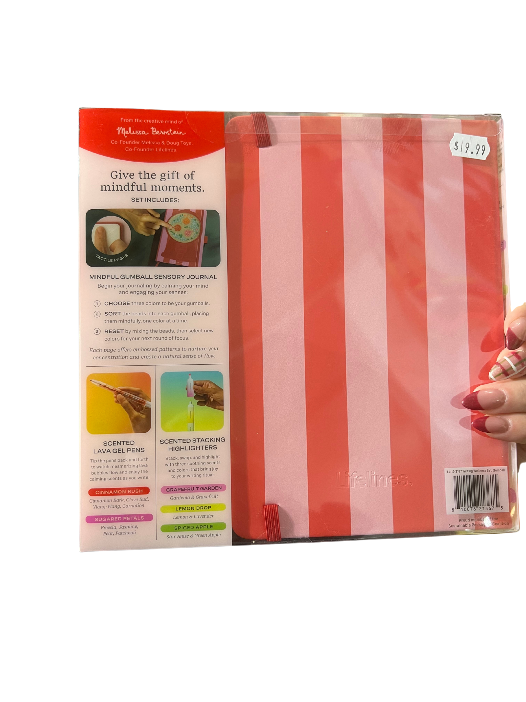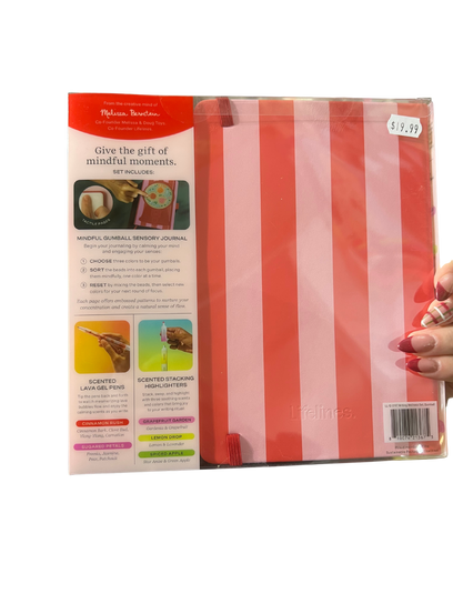 Everything you need for a peaceful writing experience -- mediation sorting journal, two lava gel pens, and scented highlighters.