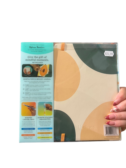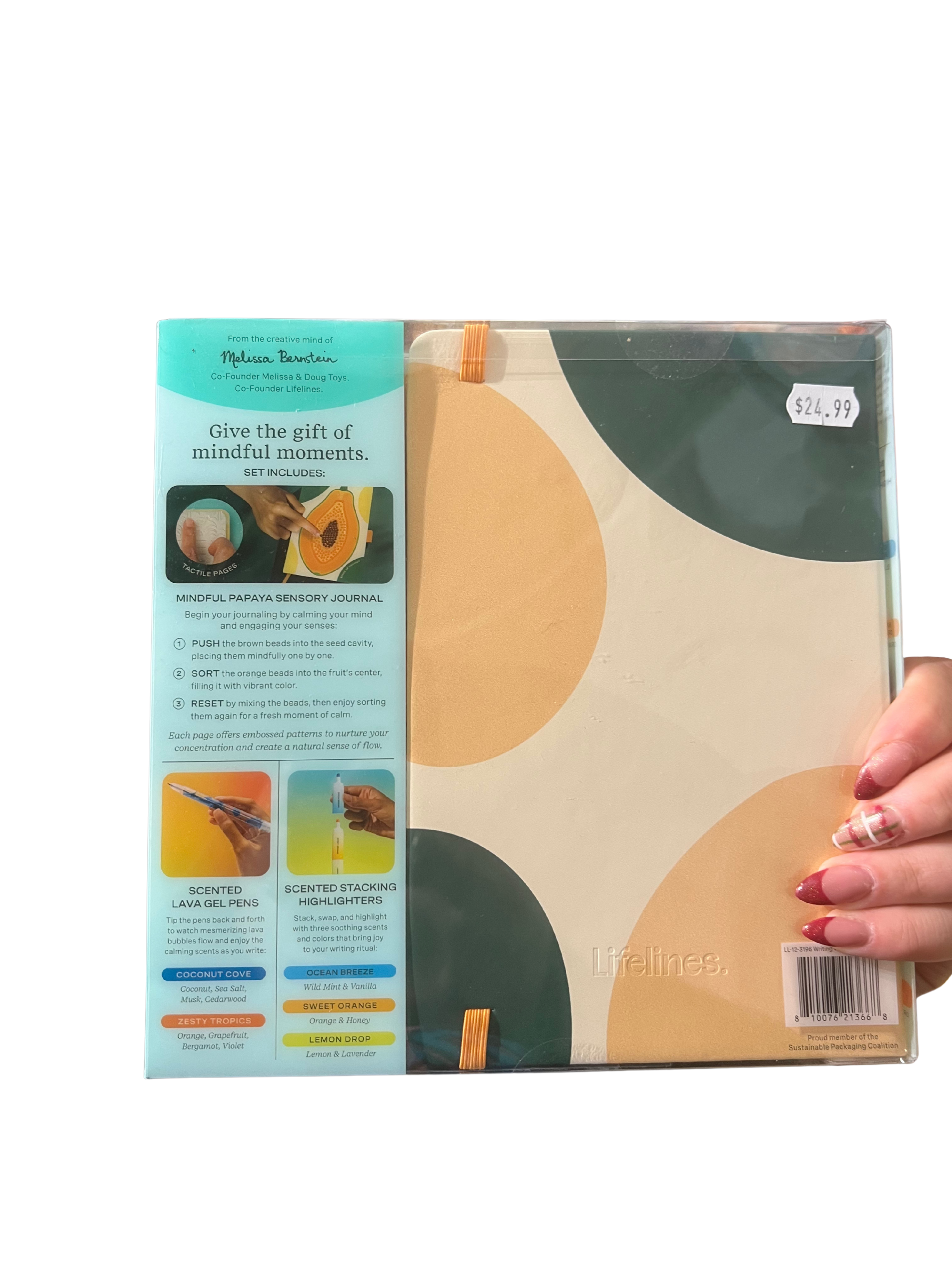 Everything you need for a peaceful writing experience -- mediation sorting journal, two lava gel pens, and scented highlighters.