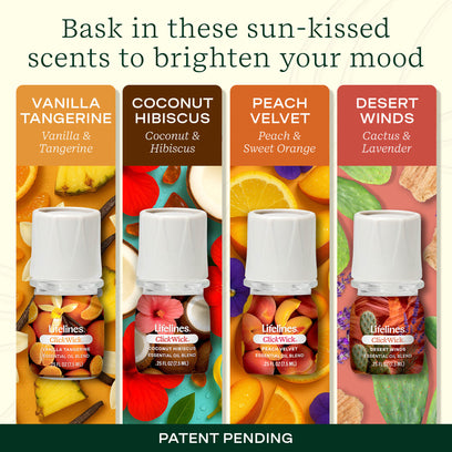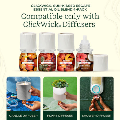 Escape into sunshine with the Lifelines Sun-Kissed Escape ClickWick Collection. This 4-pack of essential oil blends is designed exclusively for Lifelines ClickWick Diffusers—Candle, Plant, or Shower. Featuring four vibrant scents—Coconut Hibiscus, Peach Velvet, Vanilla Tangerine, and Desert Winds—each bottle transforms your space into a feel-good sensory retreat. Just click into your diffuser and enjoy up to 180 days of mood-boosting aroma. Made with pure essential oils and sustainably sourced botanicals, ClickWick blends are free from parabens, phthalates, and dyes. Let Lifelines help you create moments of calm and joy, effortlessly.