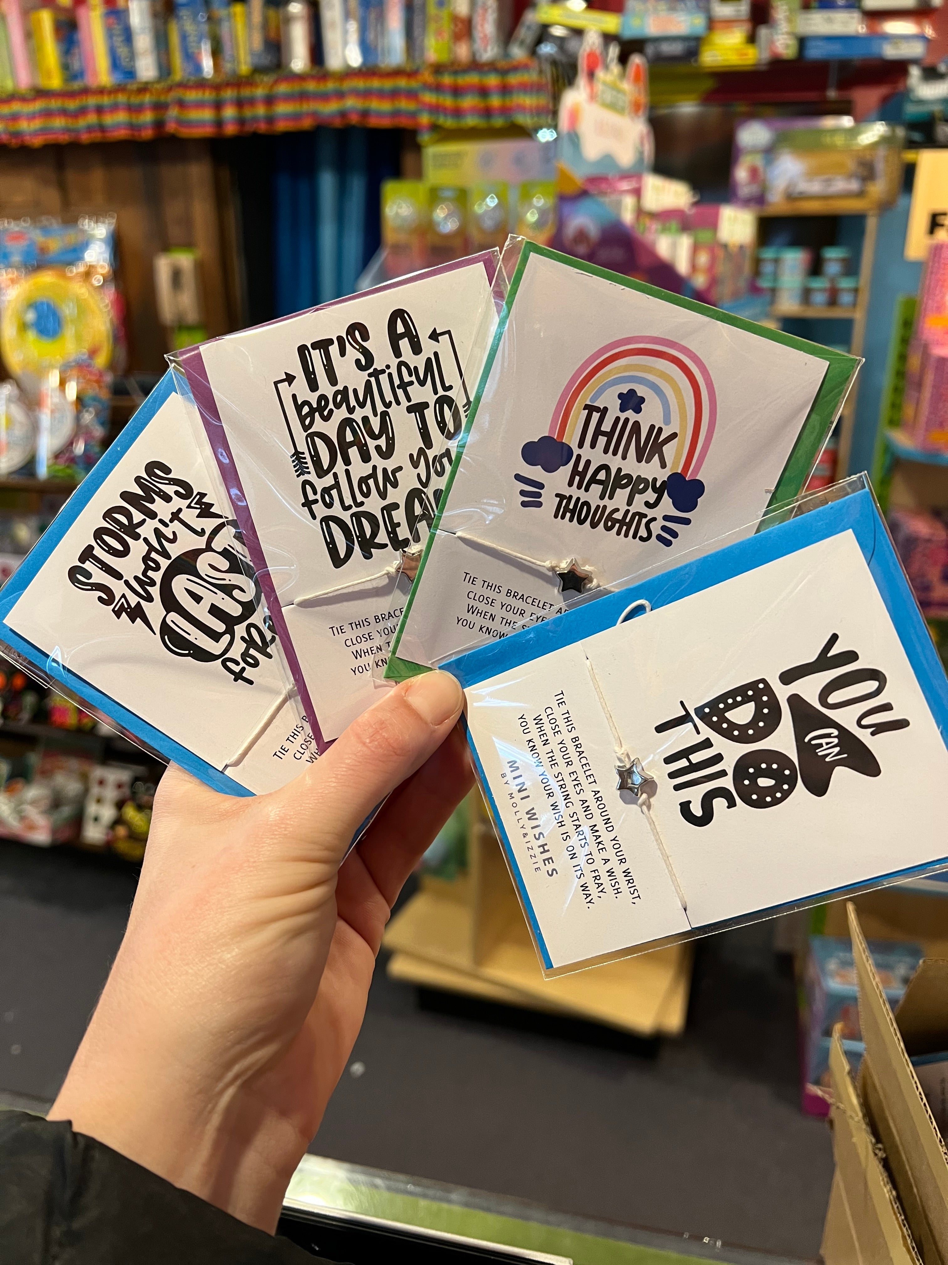 Mini Wishes are a fun way to give someone you care for a wish. All they have to do is make a wish and then tie the cord around their wrist. When the cord finally wears down and breaks the wish is released and will come true - so they say!