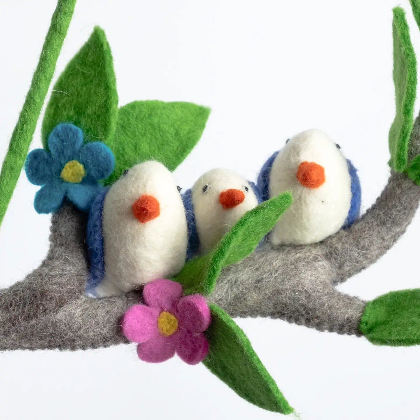 These mobiles feature a family of friendly blue birds cuddled together on a twig. Approximately 11" high x 15.5'' along branch. Made from 100% natural wool; no harsh chemicals are used during production. Our mobiles are handmade in Nepal in our family-owned workshop that follows fair trade practices. We take part of our profits and pay full school tuition for our workers' children. Perfect baby gifts & nursery decor. Handmade felt mobiles in bright colors to catch baby's attention and decorate the nursery. Each mobile features felted birds perched on a flowering branch. Baby showers, grandparent or forever family gifts, toddler bedrooms, or in garden oasis.