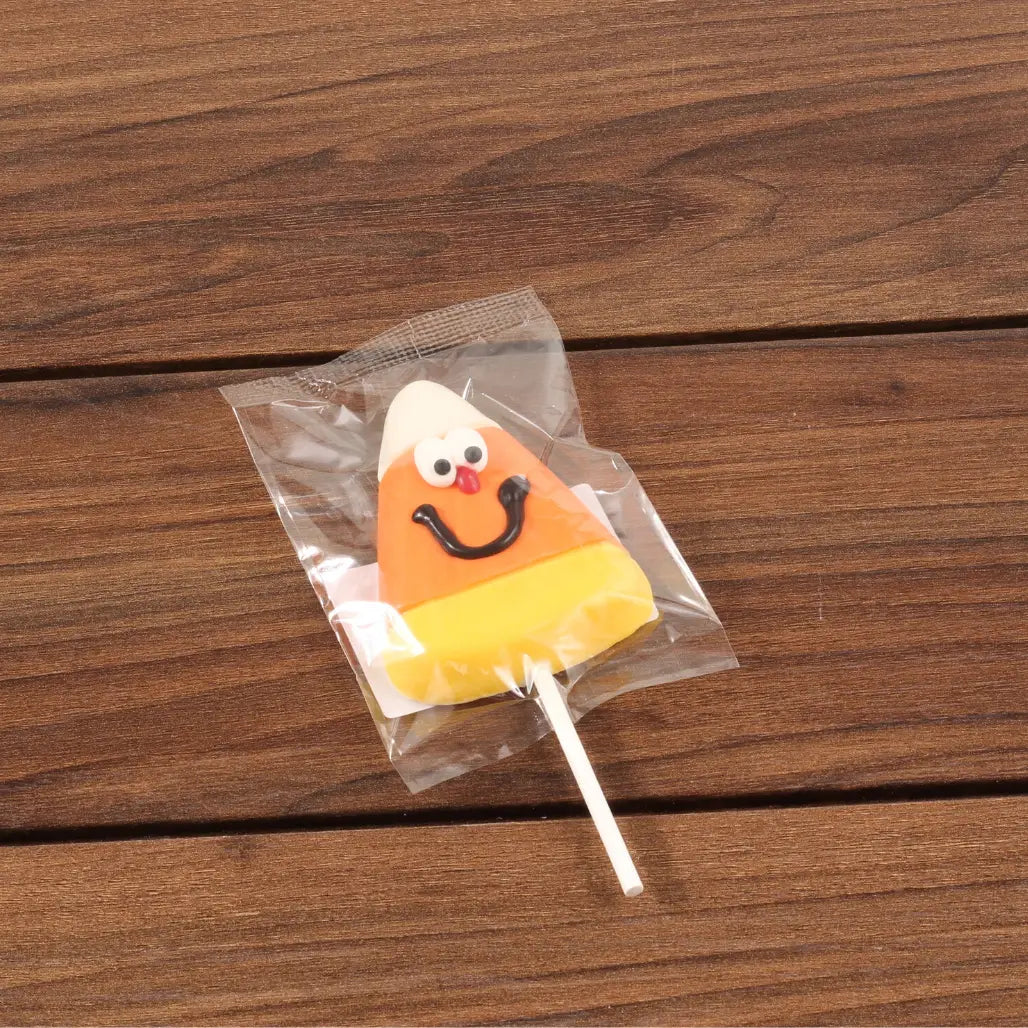 1.5 oz jumbo candy corn sucker on a stick. White chocolate with coloring.