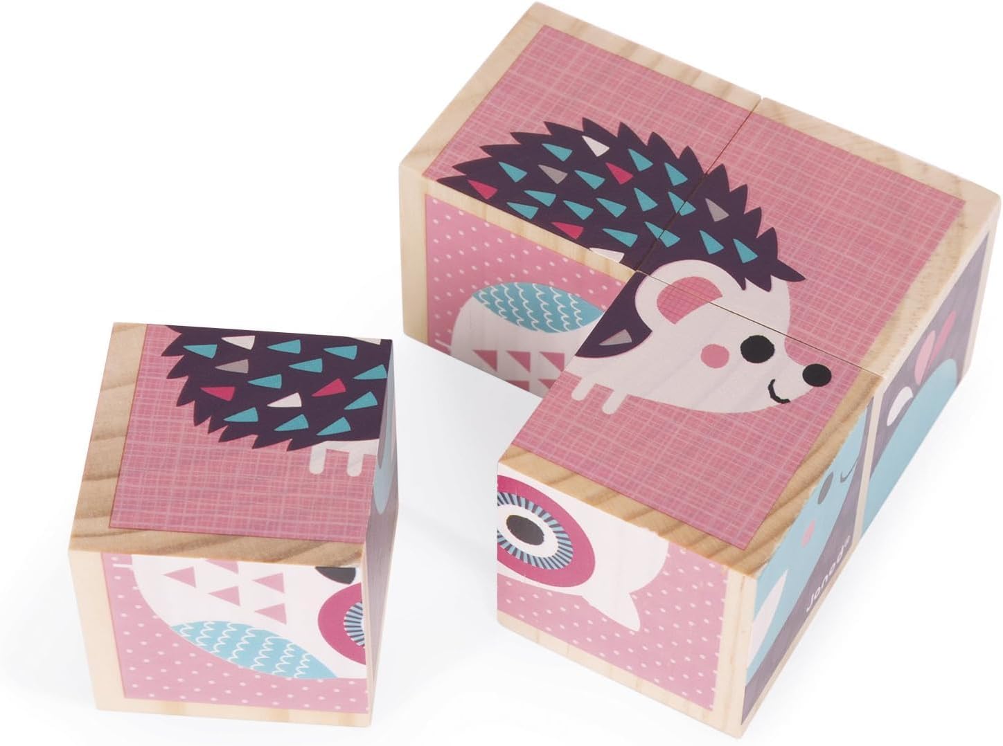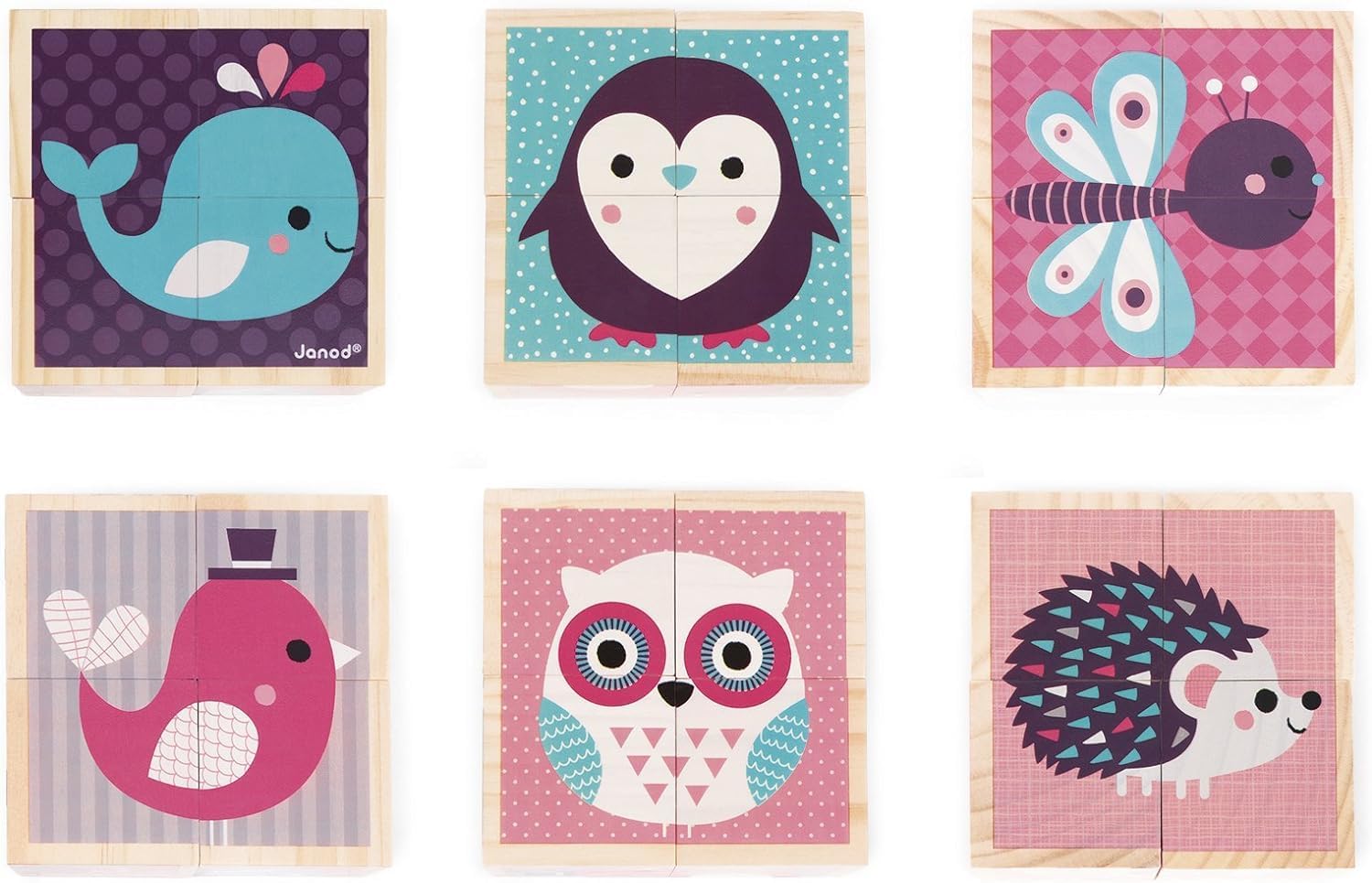 - ADORABLE PAINTED BABY ANIMALS – Includes 4 wooden cubes. The blocks are illustrated in soft colors and can be arranged to make 6 different puzzles of baby animals, including a penguin, owl, butterfly, hedgehog, whale and bird.