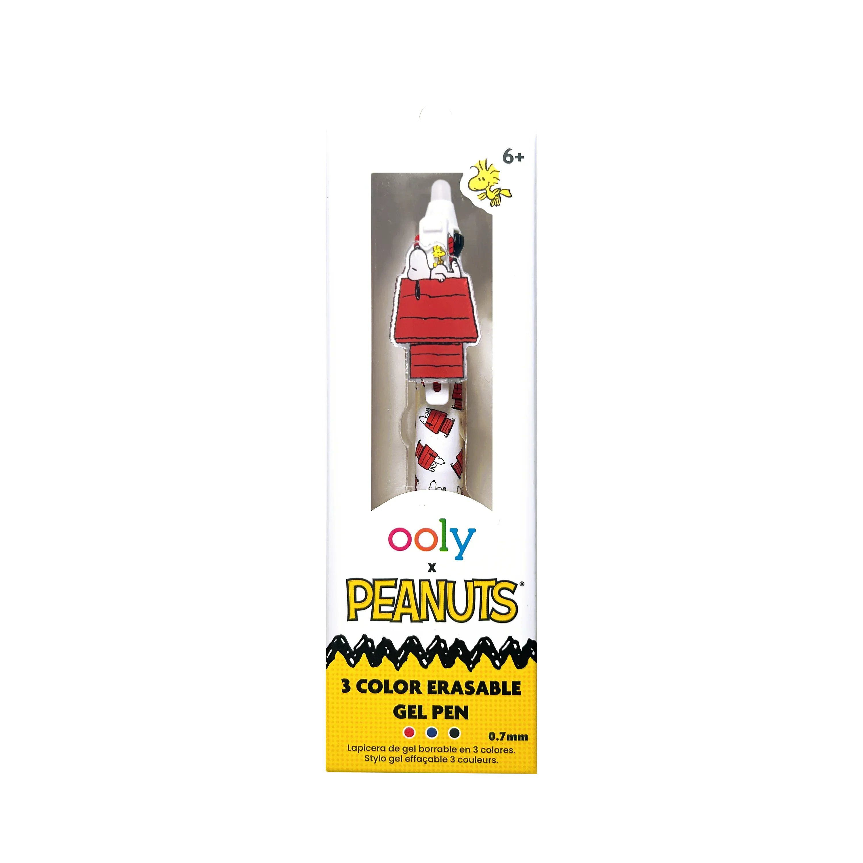 With the OOLY x Peanuts 3 Color Erasable Gel Pen mistakes are no big deal—just erase and keep going! Featuring three erasable ink colors in one, this playful multi color pen makes it easy to switch between 3 fantastic colors; black, blue and red. Whether it’s for school notes or creative projects, this erasable Snoopy pen ensures every writing moment is as fun and carefree as Snoopy himself.