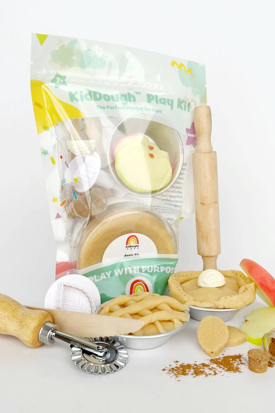 Includes: 8 oz jar of Apple Pie Scented KidDough, Wood Fluted Pie Cutter, Wood Rolling Pin, Faux Apple Slices, Jar of Cinnamon, Ice Cream Dollop Charm, Decorative Leaf Plunger, Wood Knife and Convenient Resealable Storage Bag