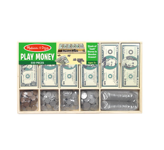 Never be short of (pretend) cash again! With fifty of each denomination, this set includes familiar looking paper bills and plastic coins. This stash of cash conveniently stores in a handy wooden "cash drawer" box. Each compartment has the denomination printed inside for easy matching cleanup.