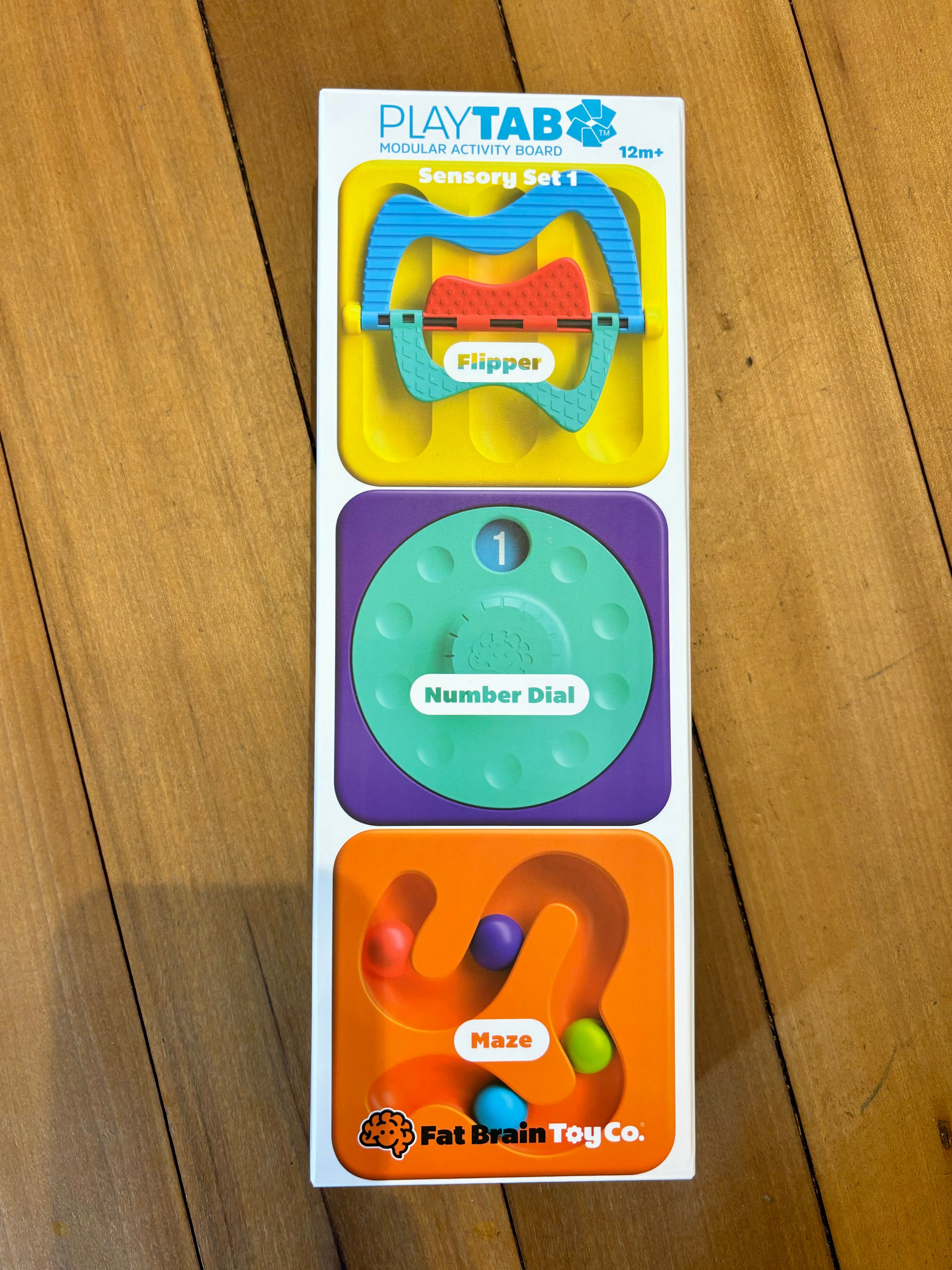 PlayTab Modular, customizable activity board Encourages fine motor skills, sensory learning, creativity Tiles attach to the wooden board magnetically. 6 tiles fit onto the board. Great for on the fridge, or on-the-go -- just throw a few tiles in the diaper bag!