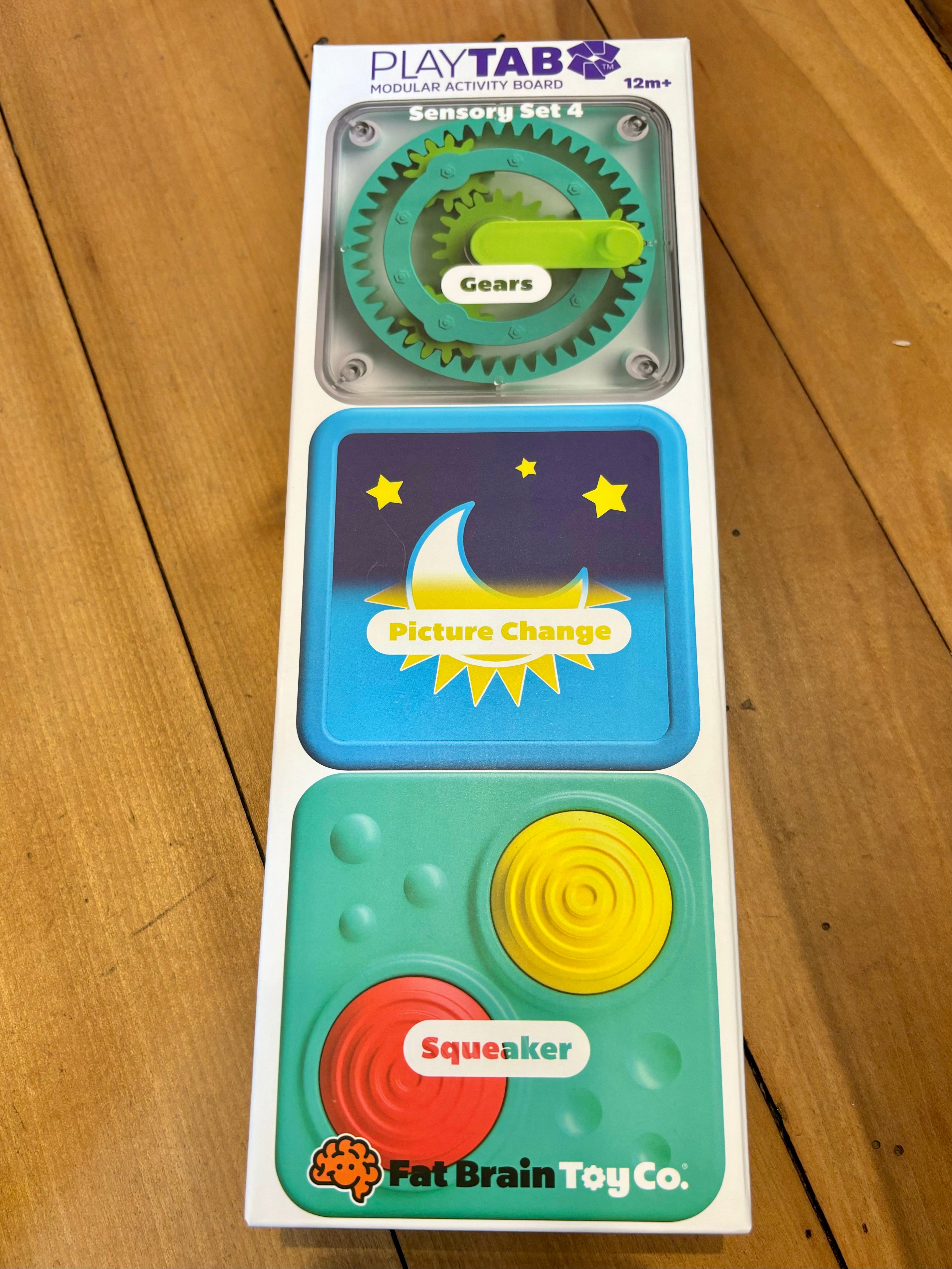 PlayTab Modular, customizable activity board Encourages fine motor skills, sensory learning, creativity Tiles attach to the wooden board magnetically. 6 tiles fit onto the board. Great for on the fridge, or on-the-go -- just throw a few tiles in the diaper bag!