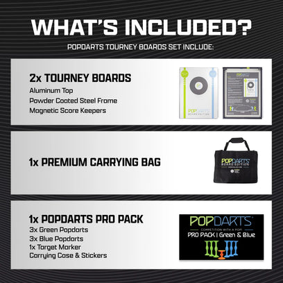 - WHAT’S INCLUDED? 1 Official Tournament Board with Built in Magnetic Score Keeper. Popdarts Sold Separately
