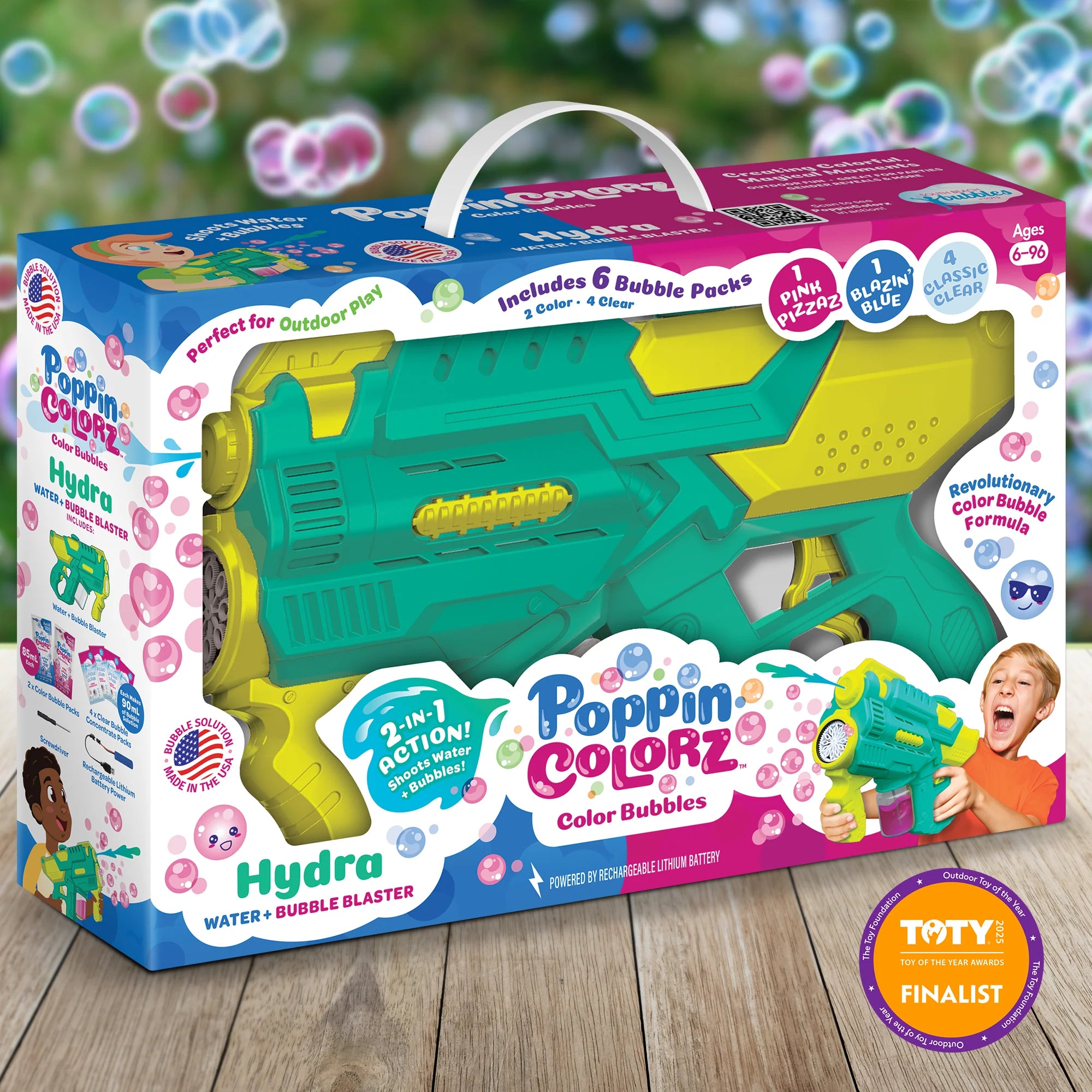 Introducing PoppinColorz Hydra 2025 TOTY FINALIST (Toy of the Year Awards): the ultimate 2-in-1 Color Bubbles Blaster and Water Gun, with bubbles proudly made in the USA! With 2 Color Bubble Liquids and 4 Clear Bubble Solutions, the fun never ends. No dipping is required, no spills for toddlers, just magical color bubbles that will vanish.