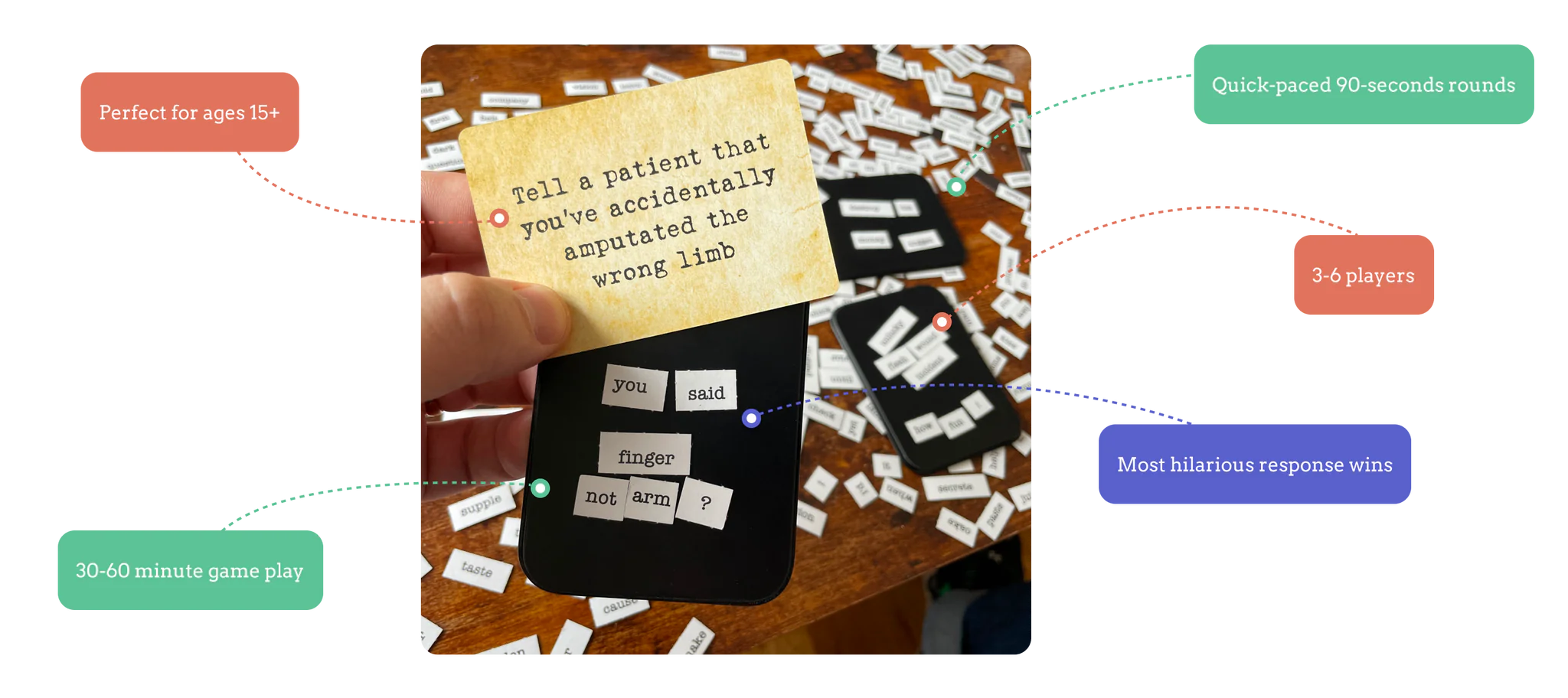 Craft your own answers to creative & complex prompts… with a pool of completely random words! Each round, a prompt is drawn and everyone has to respond by piecing together an answer on their magnetic tray.