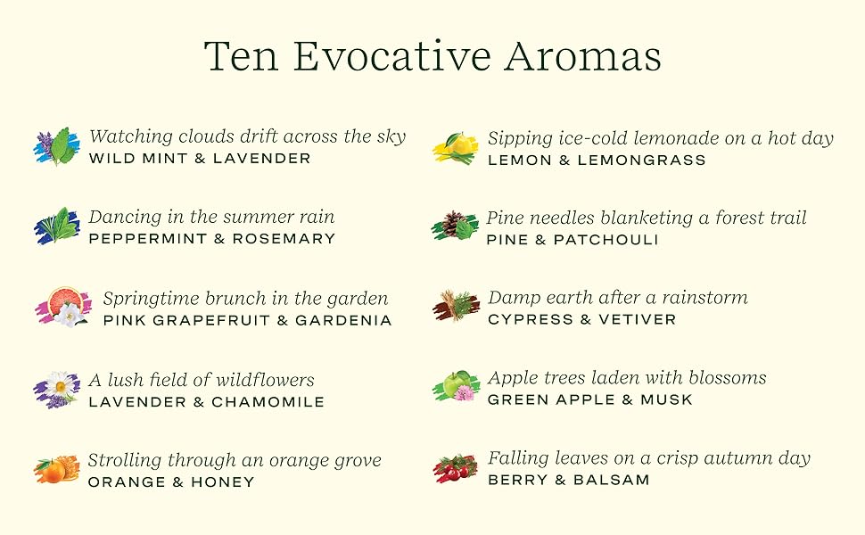 - ONLY THE GOOD STUFF: Essential oil blends specially created for an natural aroma experience using 100% pure essential oils & sustainably sourced botanicals from around the globe. They are free from parabens, phthalates, dyes, & formaldehyde donors.