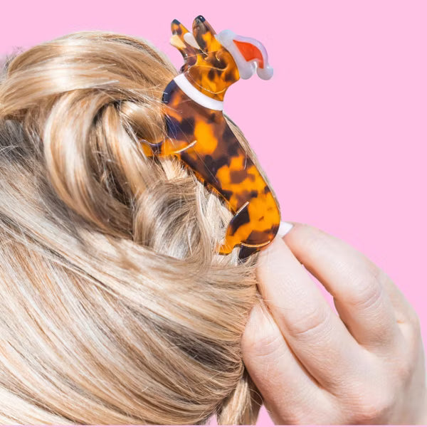 Bring a touch of holiday whimsy to your hair accessories with this adorable dog-shaped hair clip featuring a playful Santa hat and shimmering gold foil details. This delightful clip is perfect for all hair types, providing a secure hold for thin, medium, and thick hair alike. Made from durable plastic, it's a practical yet fun addition to your holiday look. This clip makes for a fantastic stocking stuffer, bringing joy and functionality to any holiday celebration.