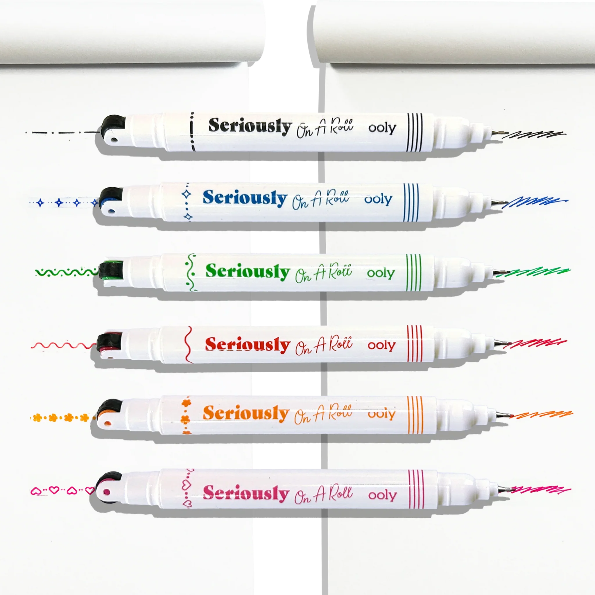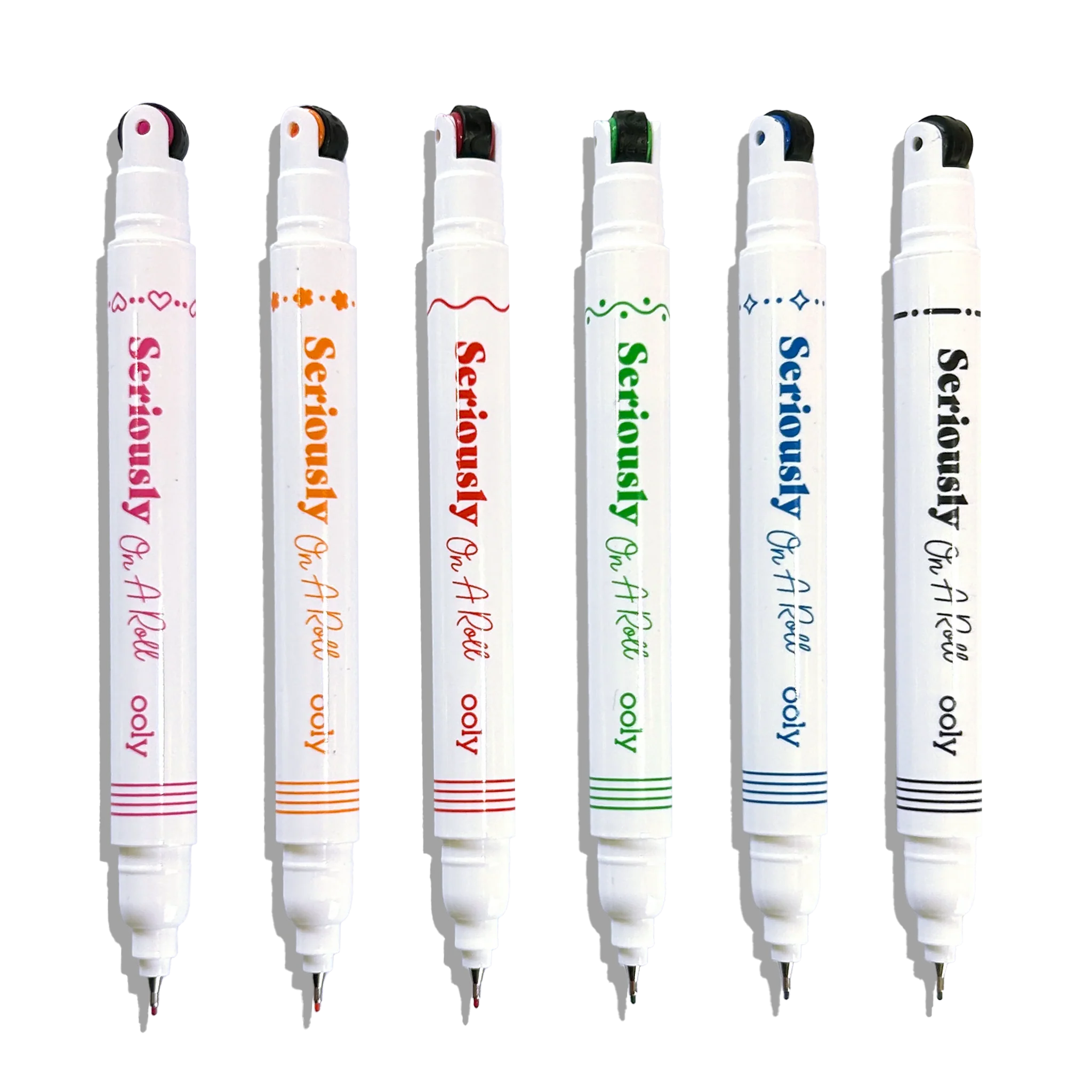 Get creative with every stroke using the Seriously On A Roll Roller Stamp & Fine Tip Markers! This set of 6 stamp markers combines roller stamper markers with fine tip markers, giving you the best of both worlds. Use the roller stamper end to add fun patterns and designs, then switch to the fine point felt tip for detailed writing, doodling, and planning.