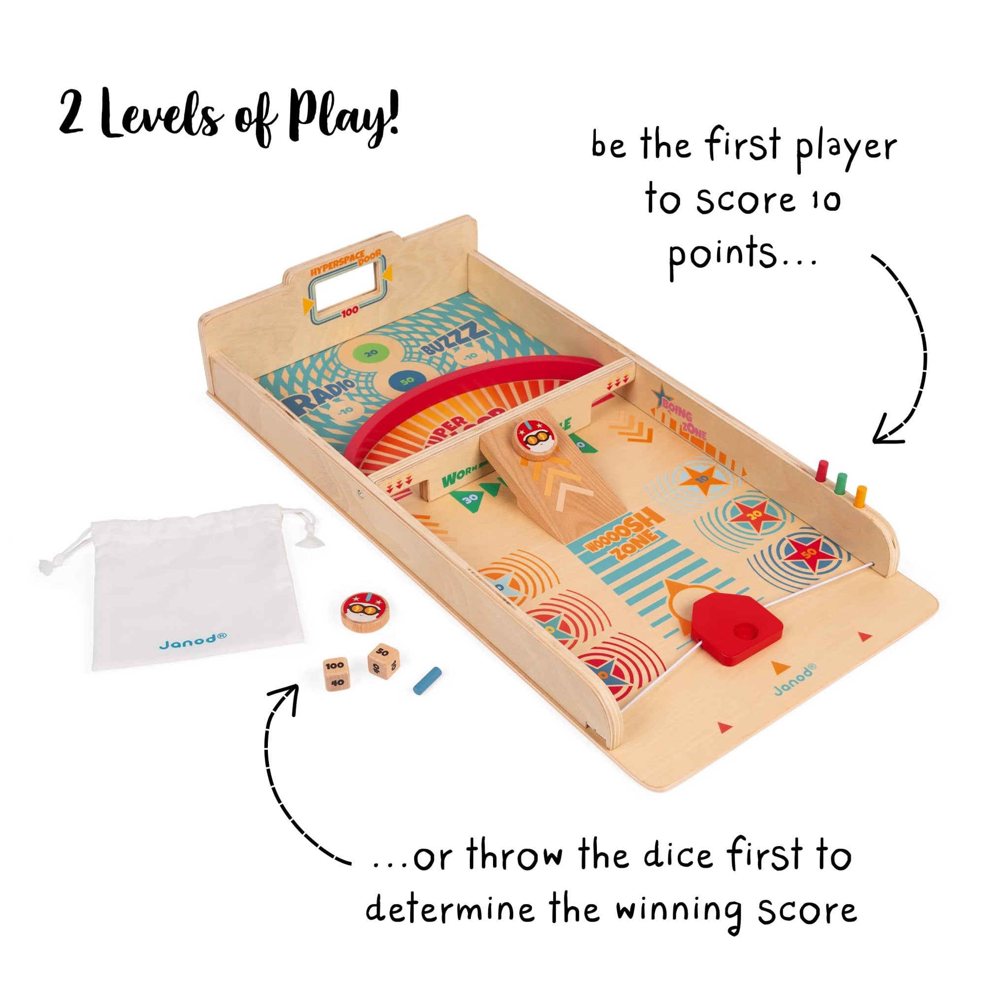 - CLASSIC SKILL GAME - Janod has taken this traditional table-top game to a new level with a high-quality wooden base, wood dowels and pucks. Take your turn and try to shoot the puck as far as possible up the slanted game board. But beware! Shoot the puck too hard and you will lose points!