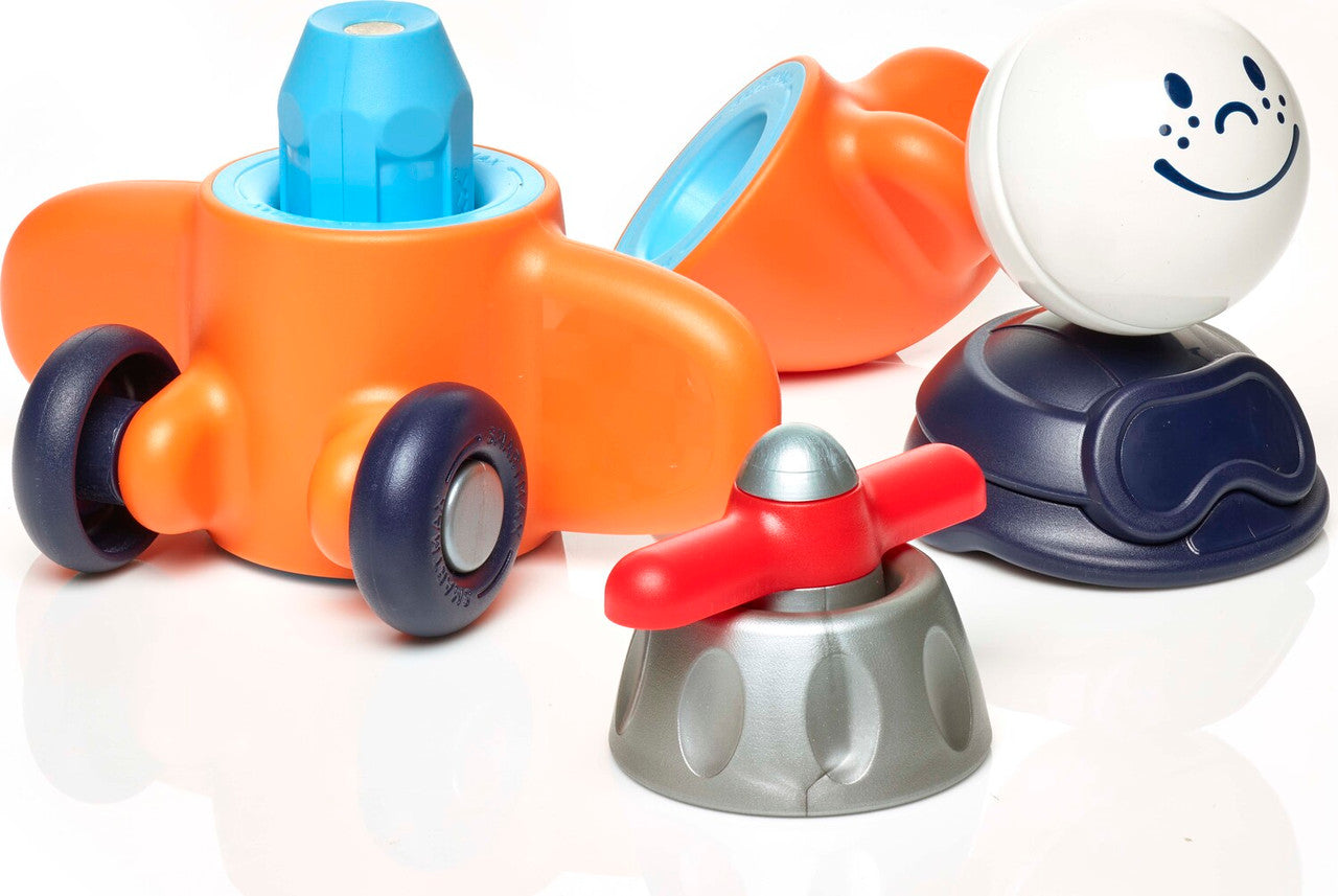 My First Plane is a magnetic play set that seamlessly integrates into the SmartMax universe. Build your plane and let your pilot fly or combine your set with other SmartMax products and create unique and cool looking vehicles. The different parts of the plane magnetically connect to a SmartMax bar. My First Plane sparks imagination, fine motor skills and encourages hand-eye coordination.