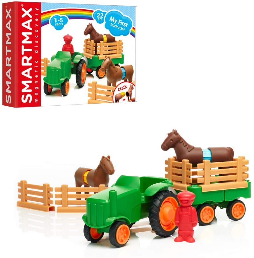 SmartMax My First Tractor Set is designed for kids ages 18 months - 5 years, offering a safe and fun introduction to magnetic discovery. Easily build the Tractor set and play with the horses and the farmer. The oversize parts of the tractor and the horses simply click on the bars, making them ideal for little hands. SmartMax My First Tractor Set includes 22 pieces and is compatible with all other SmartMax sets. NOTE: Wheel colors may vary.
