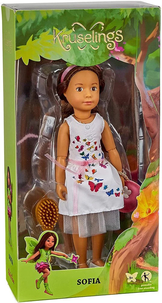 Sofia has brown hair and eyes. She is crafted from soft vinyl, with movable limbs and lifelike glass eyes.