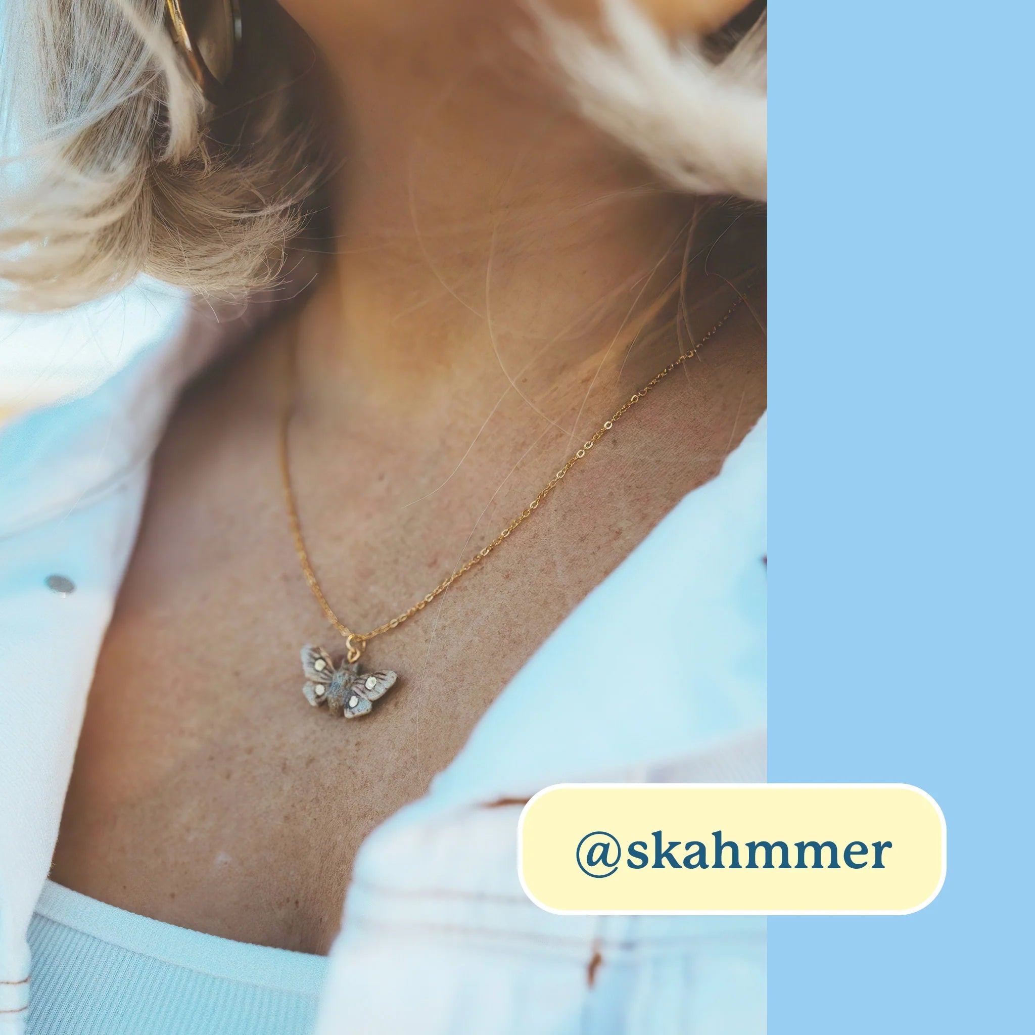 🦋 Nurture your sunny spirit with Camp Hollow’s Solar Moth necklace. Rendered in porcelain and hand-painted in earthy tones with shining gold accents, this precious little piece captures the beauty and incandescence of our favorite big star.