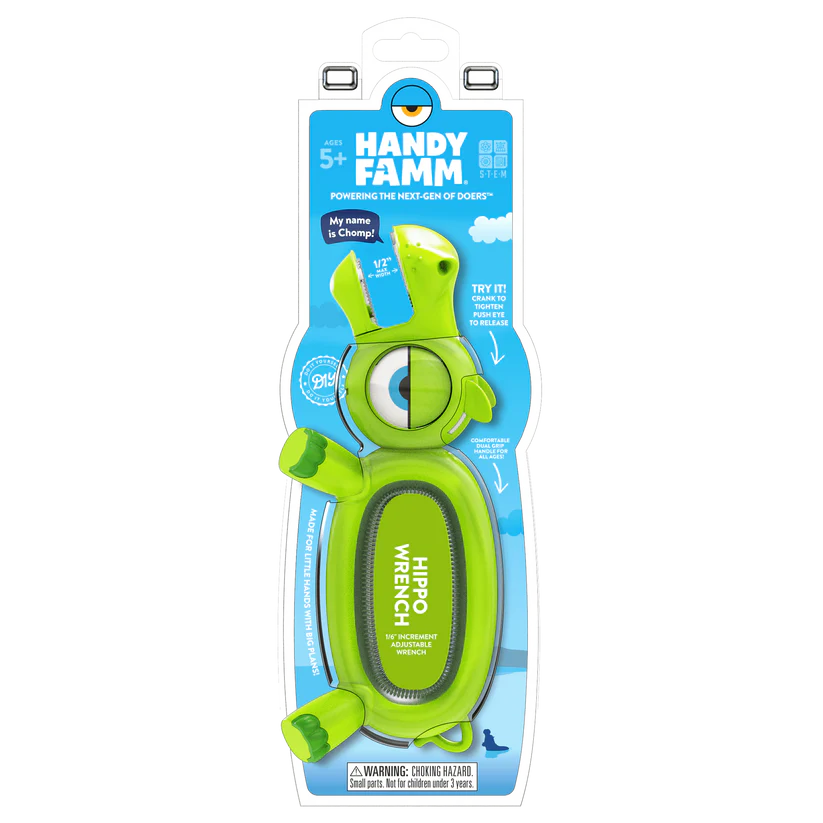 Meet Chomp the Hippo! This adjustable wrench is kid-safe, easy to use, and built for real DIY projects. With an innovative soft-in-seam grip, kids get better control and stability when tightening or loosening bolts.
