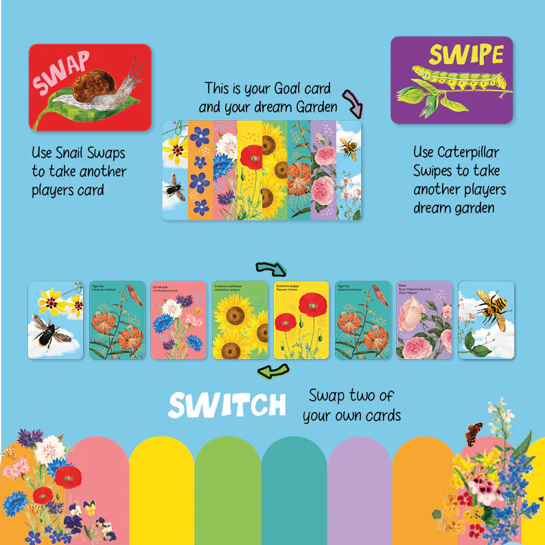 Switch, swap, and swipe cards to outwit fellow gardeners and be the first to plant your dream garden. Beware of sneaky snails and cheeky caterpillars as you fill your garden with buzzing bees and beautiful butterflies.