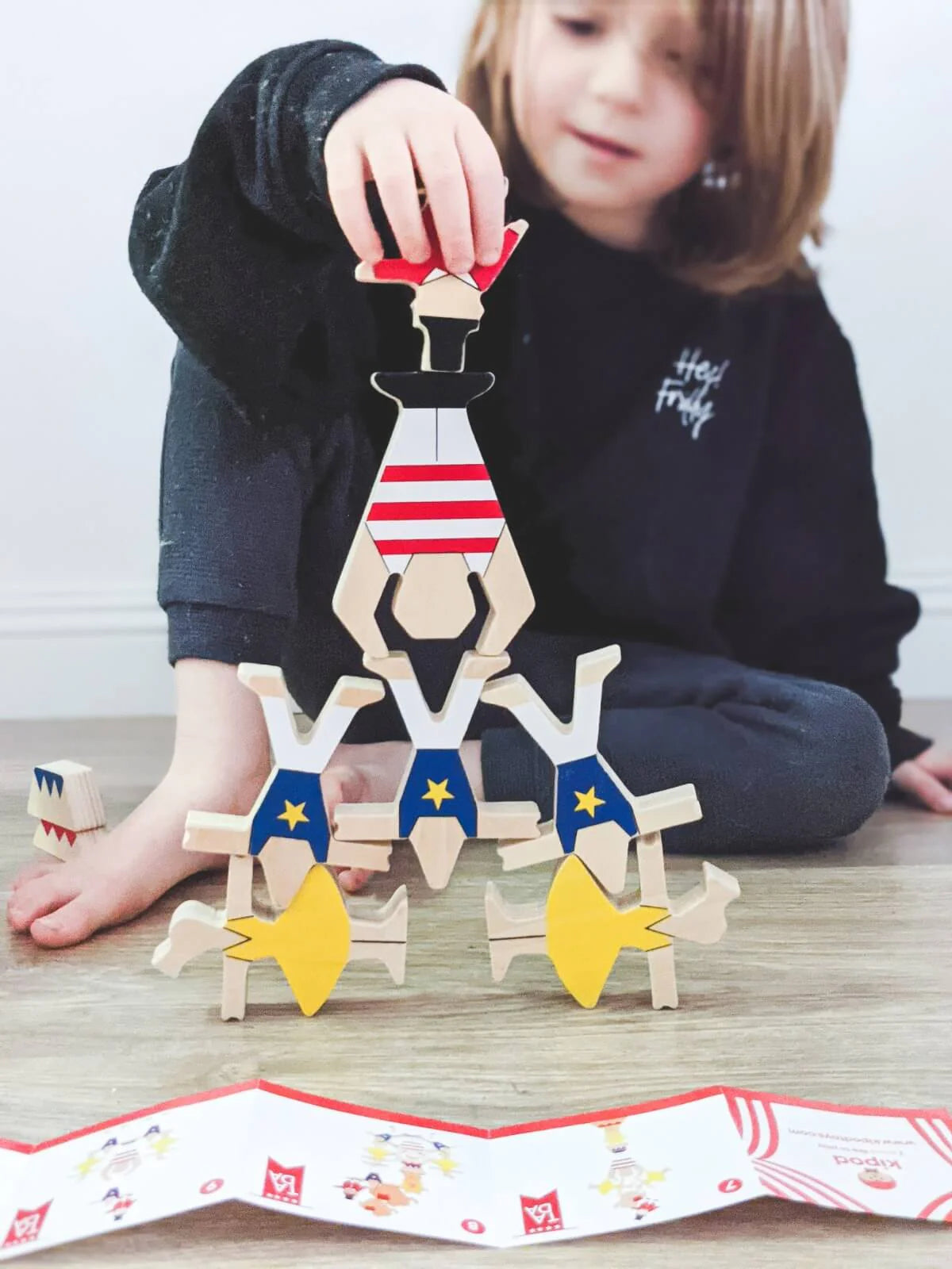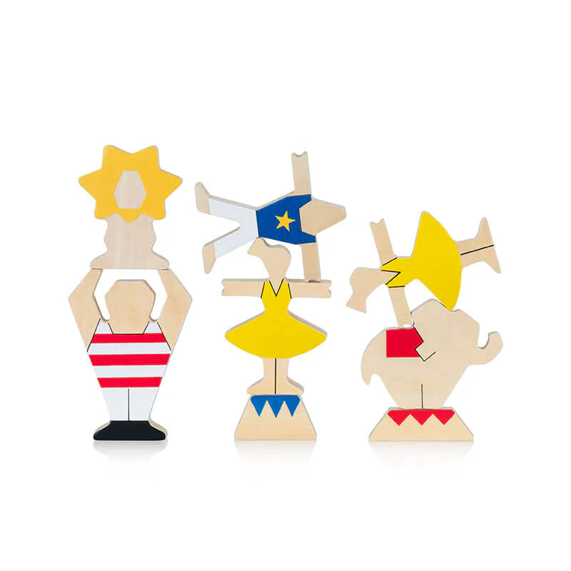 Wooden circus balancing game made up of joyful and colorful characters piled on top of each other to create fun circus shows..