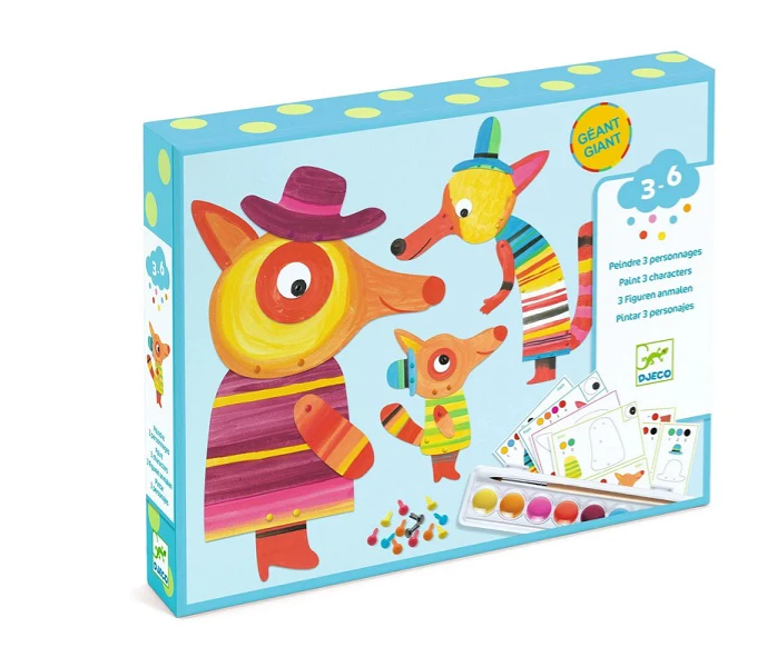 The Fox Family Painting Kit from Djeco is a unique painting craft kit for children. Everything is included from the paint supplies and brushes, the character pieces, and even a tablecloth to protect your crafting area. The three characters your child will assemble are huge; like 11 to 19.5 inches huge!