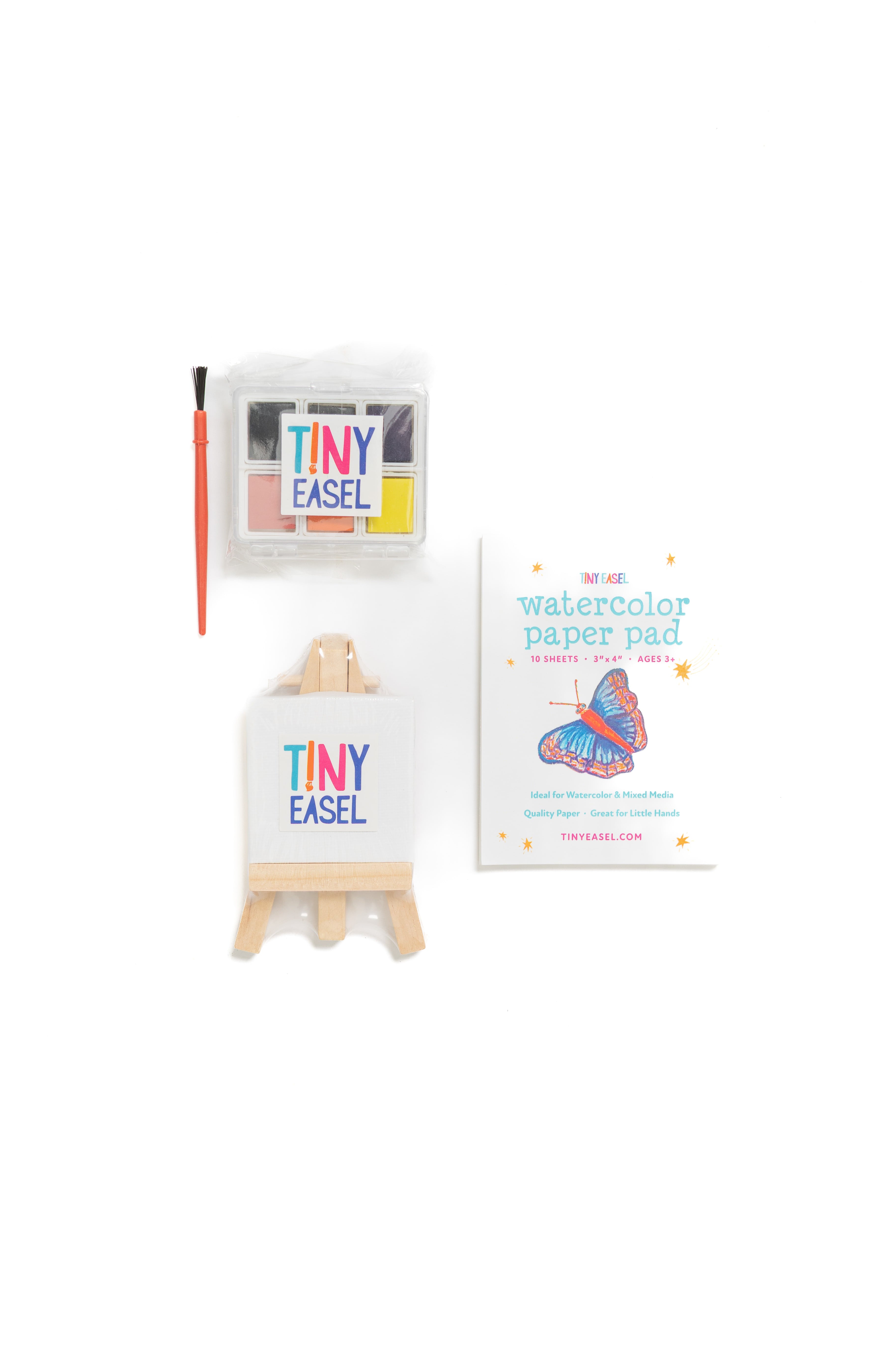 Create a mini masterpiece on our tiniest canvas! Includes 6 color paint set and mini watercolor pad.